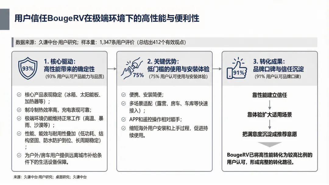 用户真正愿意买单的原因,最核心的一条并不是便宜,而是高性能带来的确定性。久谦中台·用户研究的1,347条用户评价中,93%的用户认可BougeRV的产品能力与品质,集中肯定冰箱、太阳能板、加热器等核心产品的性能稳定、制冷制热效率高、充电表现可靠,甚至在高温、暴雨、沙漠等环境下仍能维持正常工作。对户外和房车用户来说,这类评价的分量很重,因为他们购买的不是一个单品,而是一套在远离城市补给条件下仍能正常运行的生活设备。