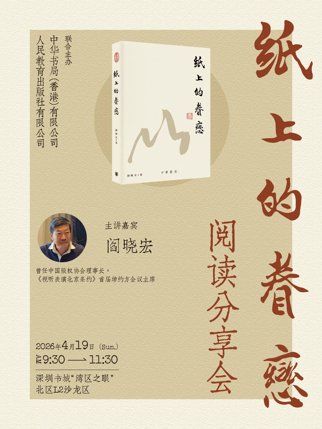 本周日上午,由香港中华书局与人民教育出版社联合主办的《纸上的眷恋》阅读分享会将在全球最大实体书城“湾区之眼”举行。作者阎晓宏先生将以文史、学术、艺术、人生为脉络,集名家追忆、书道探源、文化思考于一体。从史学旨趣到人生感悟,从学界泰斗到艺林名家,既有对阎崇年、季羡林、冯其庸、沈鹏、谢云等前辈学者与艺术家的深情追怀,也有对书法经典、书画艺术、出版事业的深度解读。