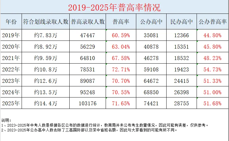 来看数据:单纯看普高率,近几年深圳普高率能达到70%多,而只看公办普高率的话,近几年一直维持在51%左右。这说明,每年都有大量学生涌向民办高中。