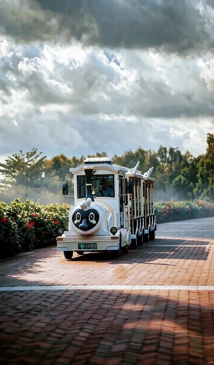 红砖铺就的步道上,奶白色的观光小火车正缓缓驶来。圆滚滚的车头带着软萌的笑脸,鸣着细碎的声响,像从童话里开出来的模样。它碾过光影斑驳的路面,载着满车的风与绿意,从花海旁驶过,从树荫下穿过,把深圳湾的温柔,一圈一圈,送到每个人的心里。坐在车厢里,风拂过脸颊,连时间都跟着慢了下来,仿佛下一秒,就能驶入没有烦恼的乌托邦。