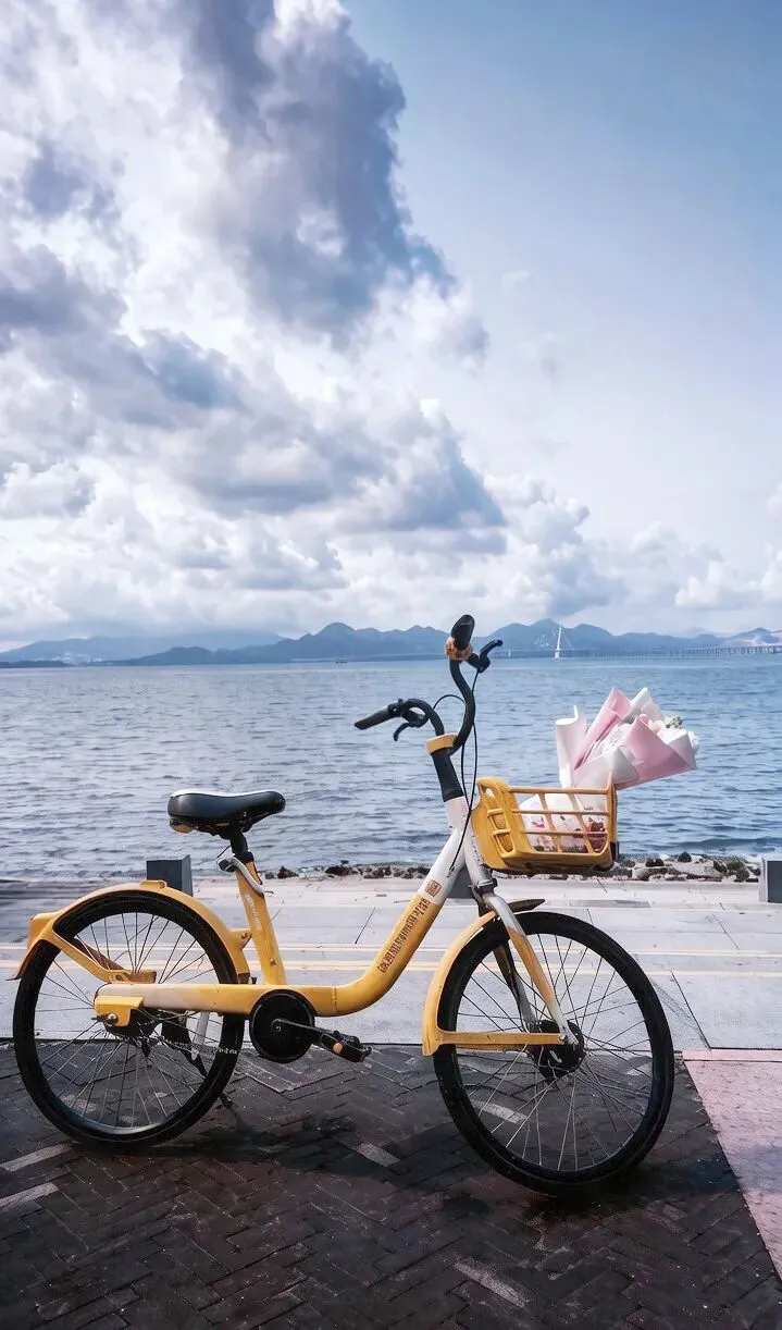 沿着海岸线往前走,一辆小黄车静静停在路边,车筐里躺着一束刚买的花。粉白的花瓣沾着海风的湿气,远处是连绵的青山,横跨海面的大桥,还有翻涌着碎金的海浪。骑上它,沿着海岸线慢慢前行,风里是海的咸,花的香,还有自由的味道。不用追赶时间,不用奔赴目的地,就把所有的烦恼都甩在身后,让深圳湾的海,接住所有的情绪。