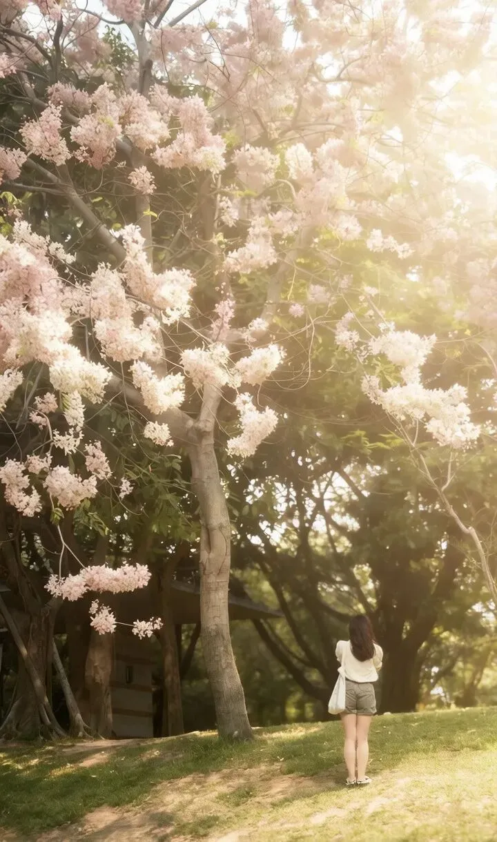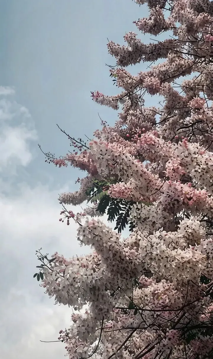 抬头的瞬间,才是深圳湾最动人的浪漫。粉白的花串缀满枝头,像一场温柔的雪,从树梢簌簌落下,落在草地上,落在发梢间,落在每一个抬头仰望的人的心上。阳光透过花瓣,筛下细碎的金,整个世界都变得朦胧又柔软。风一吹,花枝轻晃,花瓣飘落,连空气里都飘着清甜的香气。站在花树下,望着满树繁花,就像望着一整个春天的心事,那些没说出口的情绪,都被这满树温柔,轻轻妥帖安放。深圳湾的浪漫,从来都不是刻意的。它是小火车驶过的风,是单车碾过的路,是满树盛开的花,是抬头撞见的云。