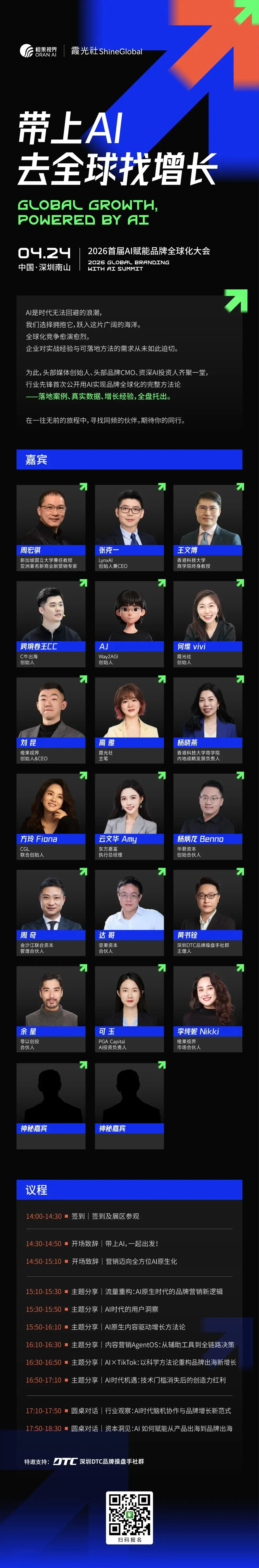 4 月 24 日,2026 首届 AI 赋能品牌全球化大会将在深圳南山开讲,我们不聊概念,只讲能落地、能变现、能复制的实战方法。