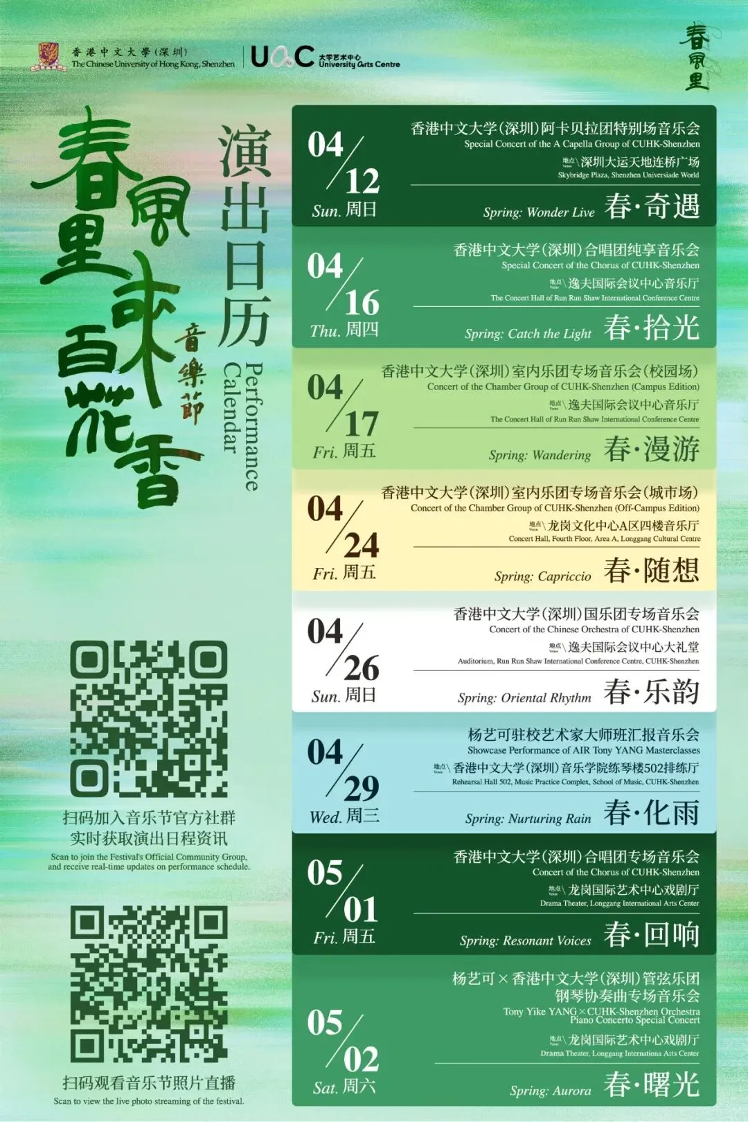 香港中文大学(深圳)“春风里来百花香”音乐节由香港中文大学(深圳)大学艺术中心倾力策划,汇聚中外艺术力量,涵盖合唱、无伴奏人声、管弦乐、室内乐、打击乐、民族音乐等多元演出形式。音乐节期间,还将同步举办音乐讲座、学术交流、艺术指导、公益演出等丰富活动。此次音乐节旨在融合校园现有音乐项目,并整合外部音乐资源,推动跨界交流与学术指导,打造开放、共享、富有国际视野的艺术交流平台,以音乐为桥梁,连接世界,启迪心灵。