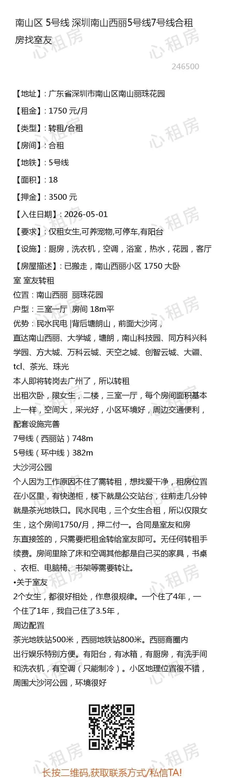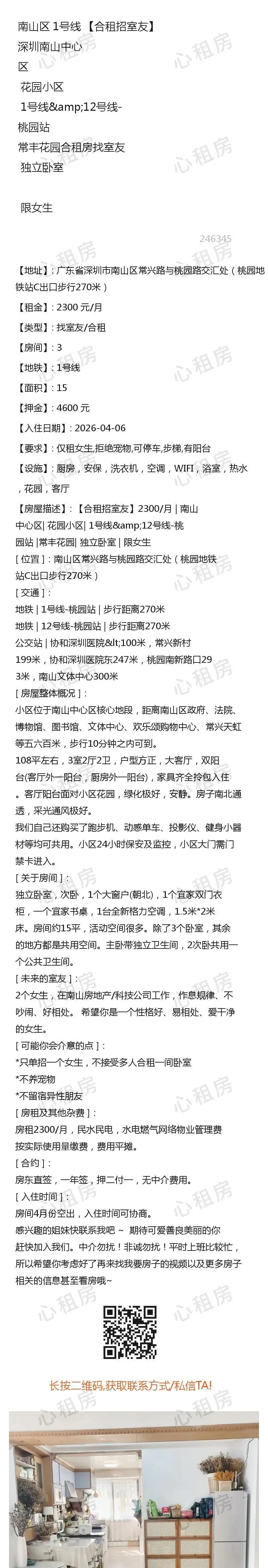 深圳租房【南山5则】房源①:5号线深圳南山西丽合租房找室友1750元/月;房源②:…