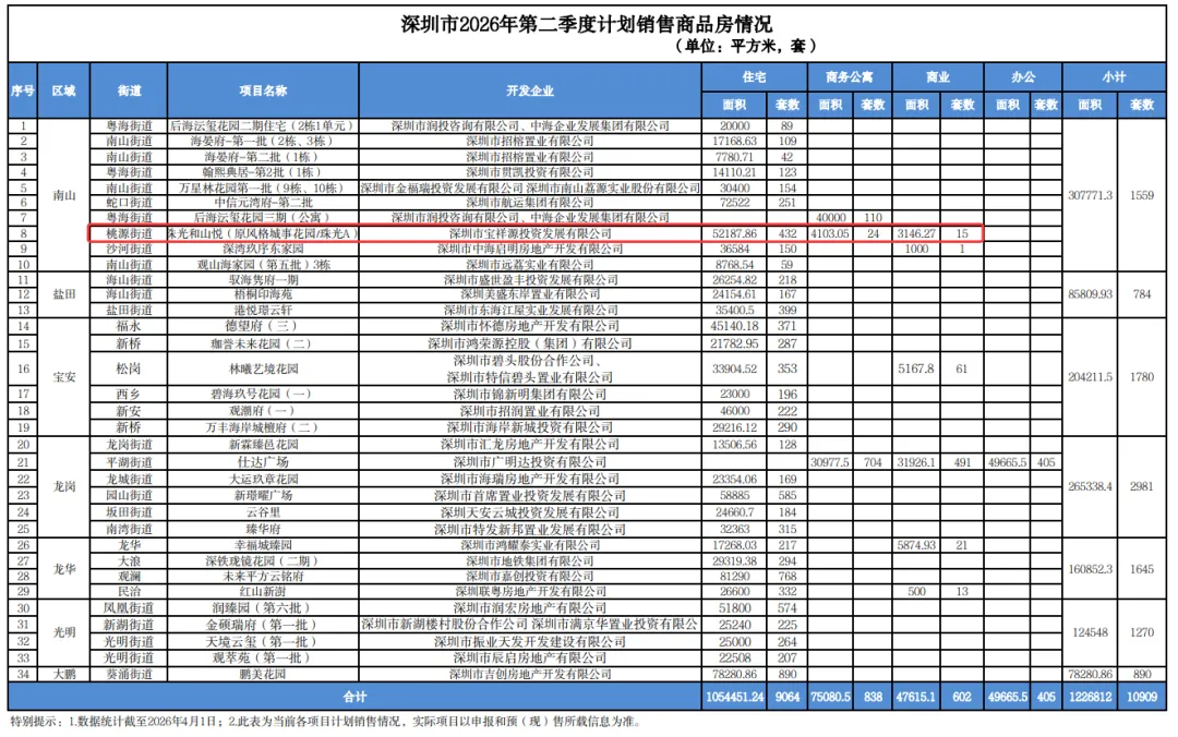 近日,深圳市住建局发布了2026年第二季度计划预售商品房清单。