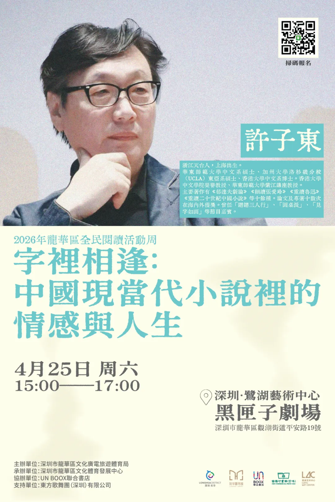 4月25日下午,誠邀書友們來到深圳·鷺湖藝術中心 黑匣子劇場,一同踏入那些文學現場,在許子東教授的帶領與解讀下,與字裡行間的個體情感與人生相逢,看清我們的來路,重新找到安頓自身的坐標。