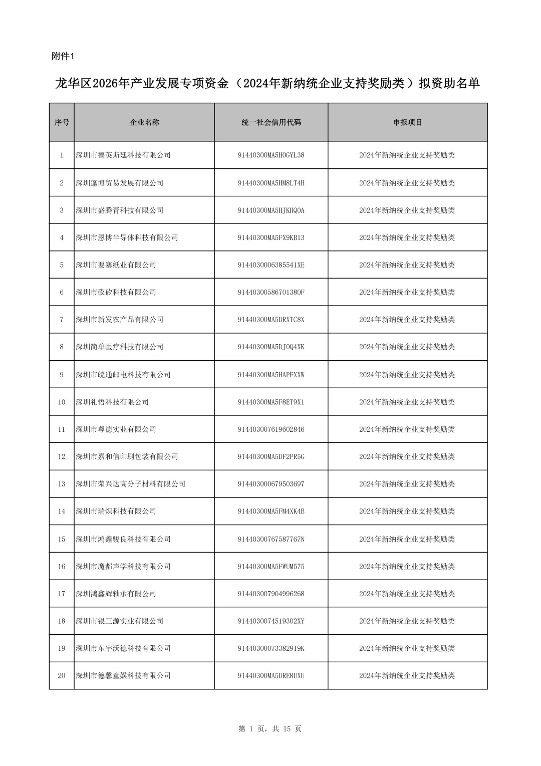 深圳市龙华区商务局关于公示龙华区2026年产业发展专项资金(2024年“1+N+S”政策申报项目)拟资助名单的通知