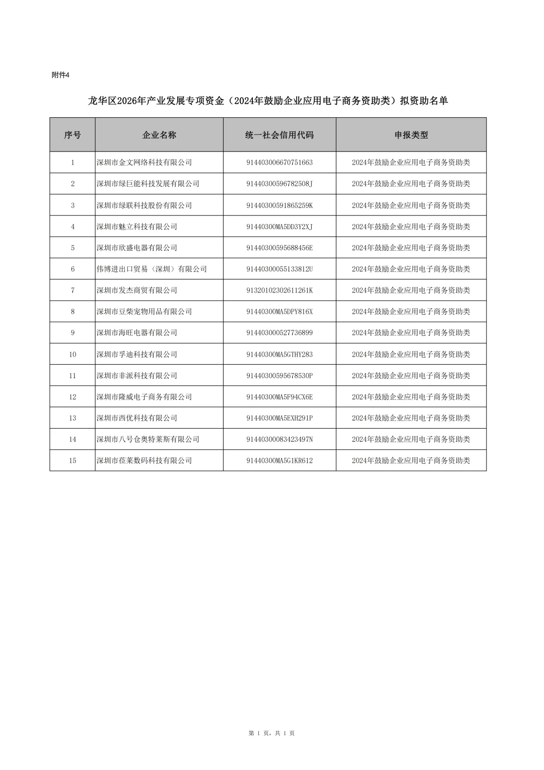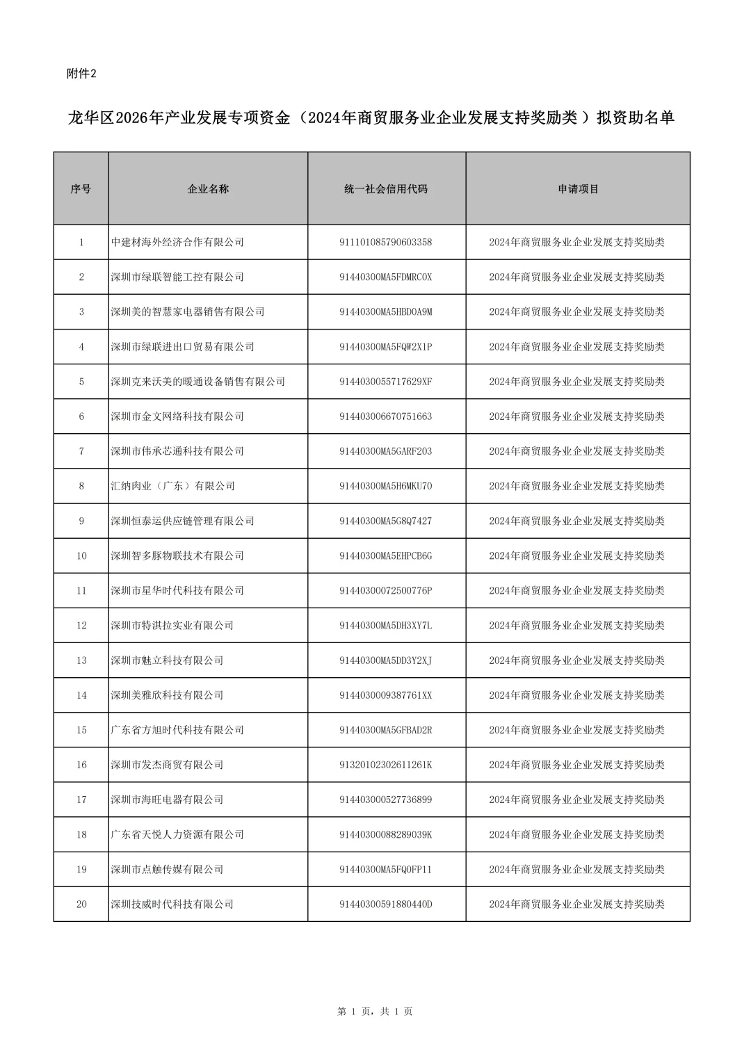 根据《深圳市龙华区促进商贸服务业高质量发展若干措施》(深龙华府规〔2021〕4号)《深圳市龙华区促进消费互联网产业高质量发展的若干措施》(深龙华府办规〔2021〕8号)(原《深圳市龙华区“1+N+S”数字经济产业政策》)及相关操作指引规定,现将2026年龙华区产业发展专项资金(2024年“1+N+S”政策申报项目)拟资助名单(详见附件)予以公示,向社会广泛征求意见。