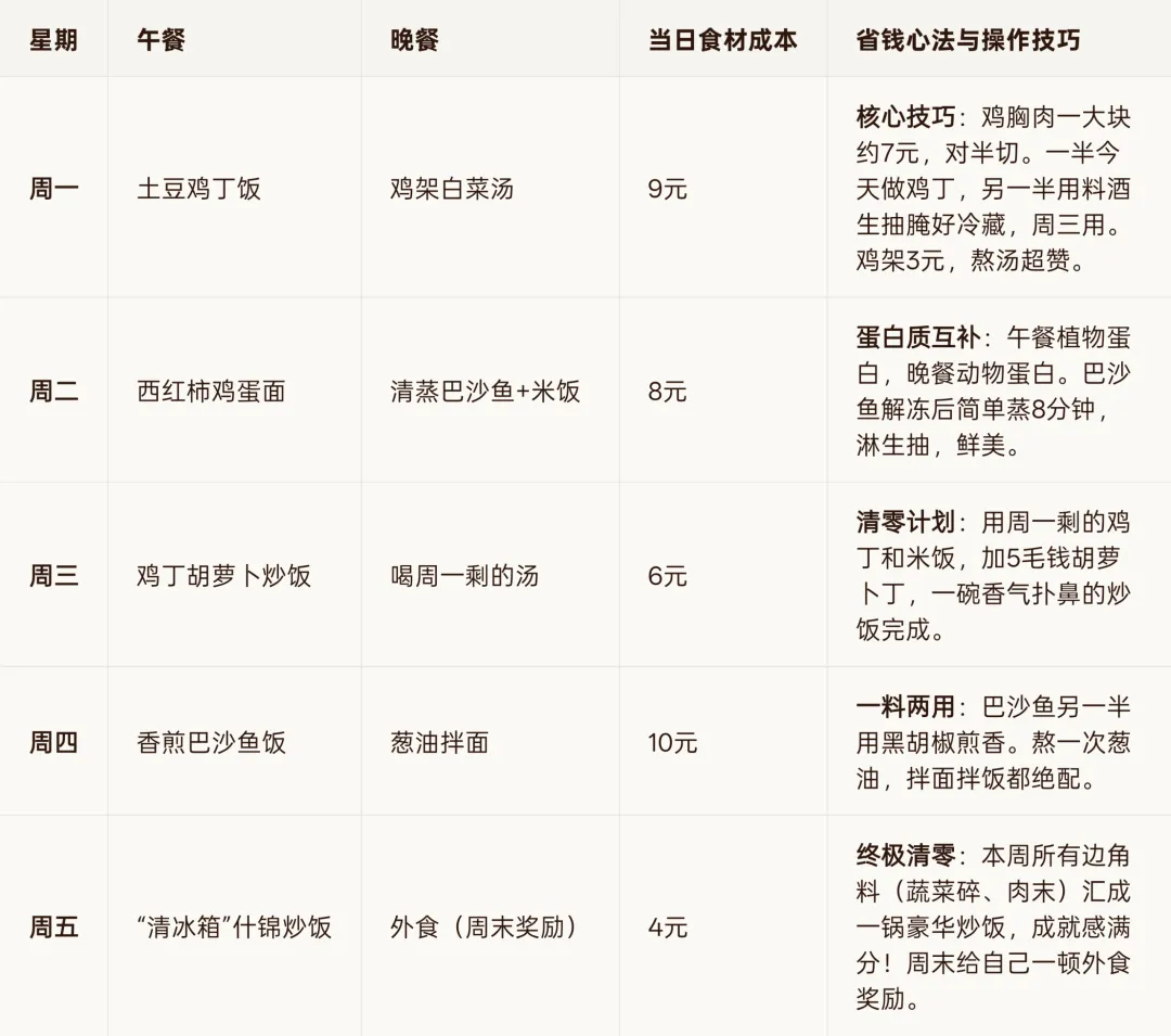 经过3个月的反复试验和优化,我终于稳定跑通了这套 “100元周餐计划” ——用100元预算,搞定5个工作日的午+晚两餐,不仅吃得饱、吃得好,关键是真的健康又省钱。
