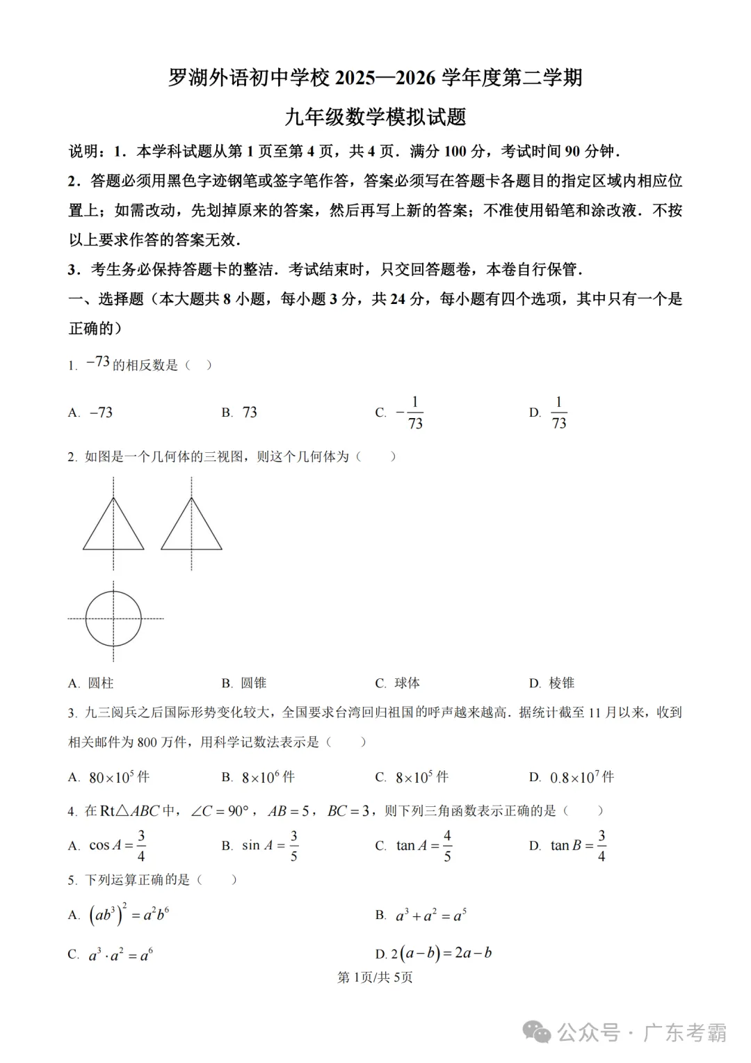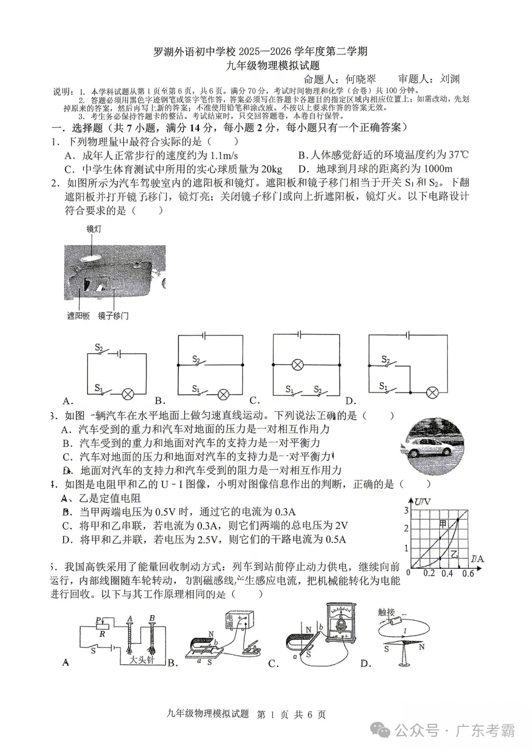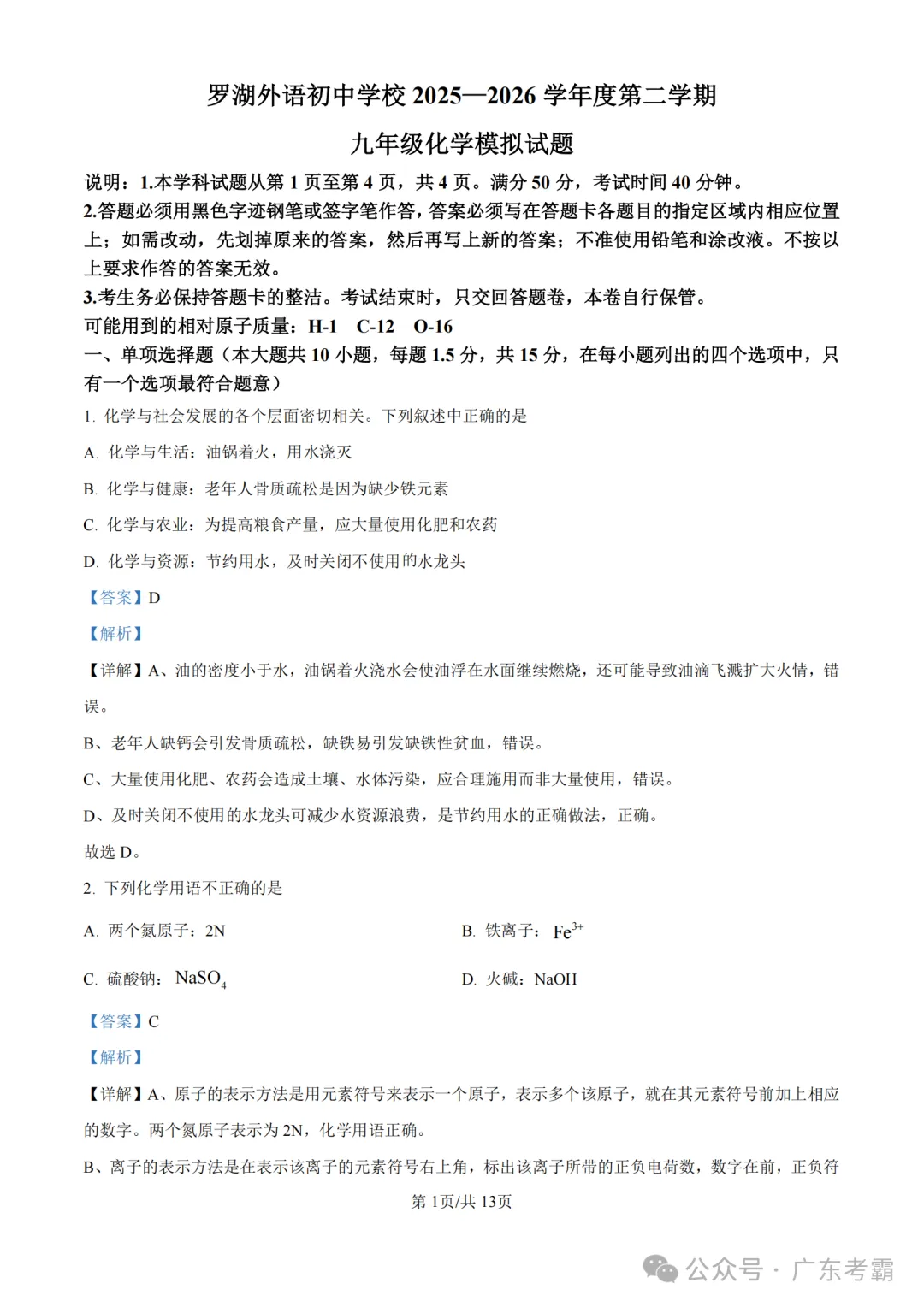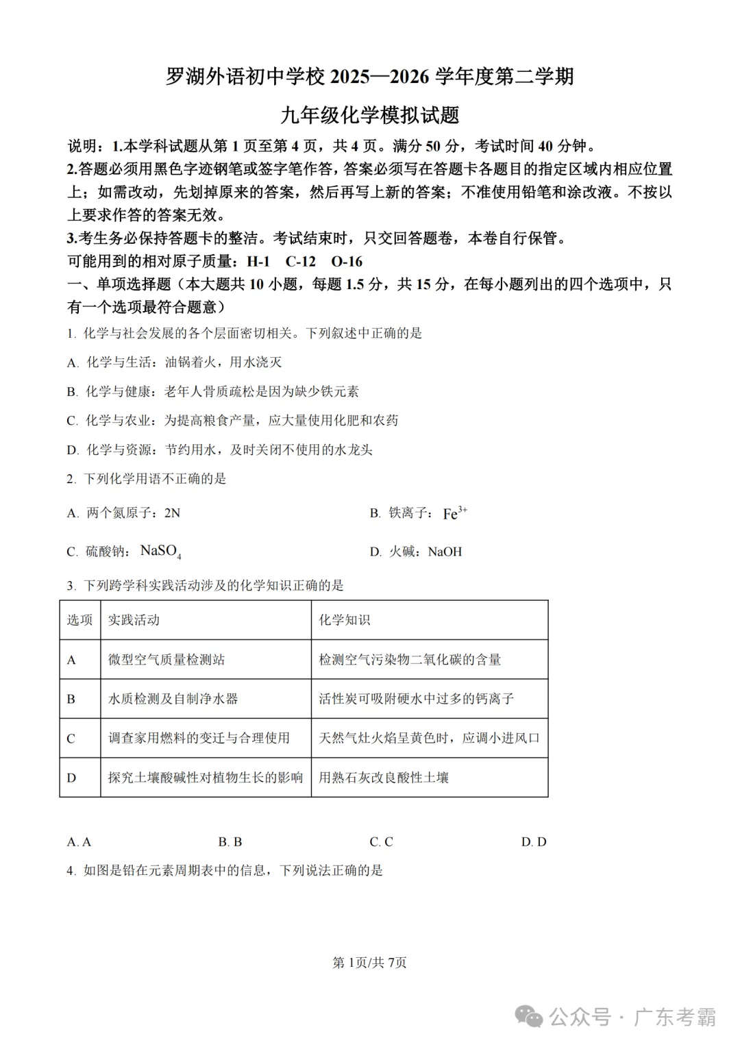 罗湖外语初级学校2026年第二学期模拟试题九年级(数学 | 英语 | 物理|化学)