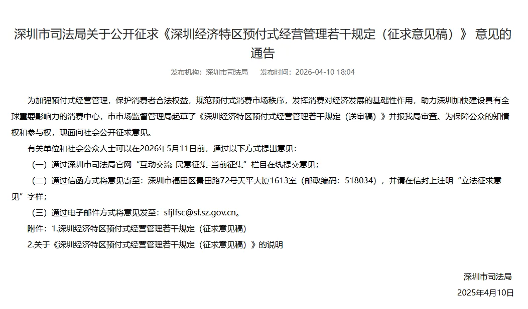 近日,深圳市司法局发布关于公开征求《深圳经济特区预付式经营管理若干规定(征求意见稿)》(以下简称《意见稿》)意见的通告。其中提到,为加强预付式经营管理,保护消费者合法权益,规范预付式消费市场秩序,发挥消费对经济发展的基础性作用,助力深圳加快建设具有全球重要影响力的消费中心,深圳市市场监督管理局起草了《深圳经济特区预付式经营管理若干规定(送审稿)》并报司法局审查,现面向社会公开征求意见。