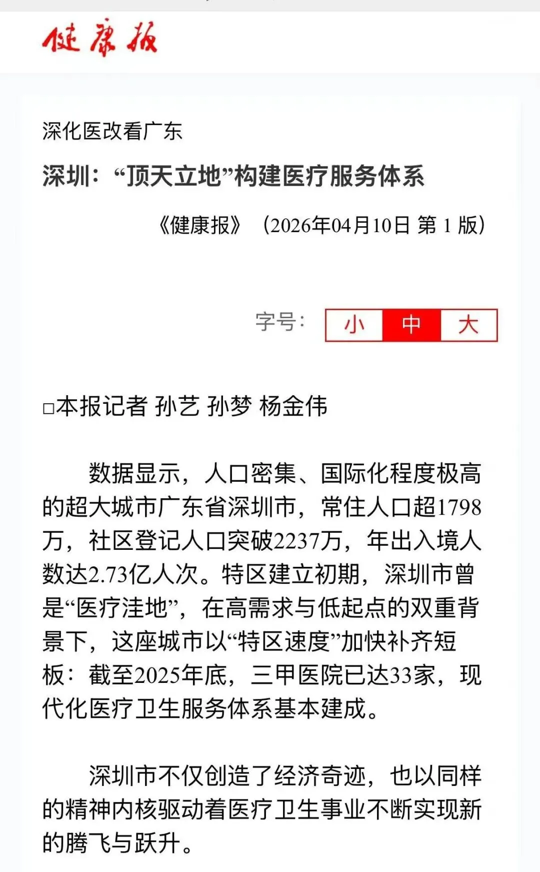 数据显示,人口密集、国际化程度极高的超大城市广东省深圳市,常住人口超1798万,社区登记人口突破2237万,年出入境人数达2.73亿人次。特区建立初期,深圳市曾是“医疗洼地”,在高需求与低起点的双重背景下,这座城市以“特区速度”加快补齐短板:截至2025年底,三甲医院已达33家,现代化医疗卫生服务体系基本建成。