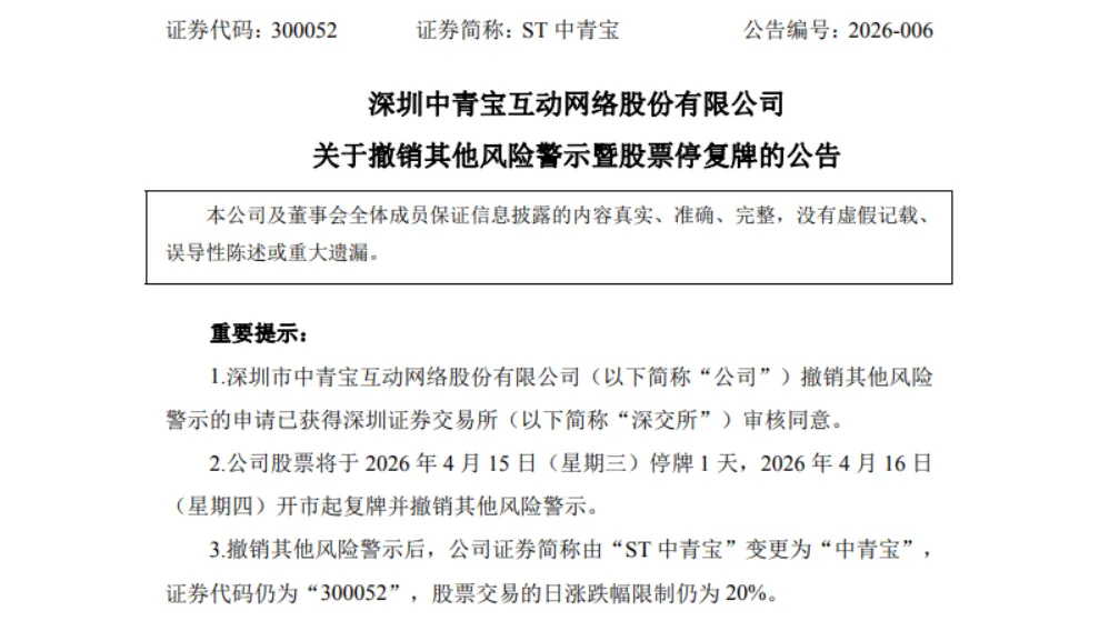 4月14日晚间,A股老牌游戏公司中青宝发布公告,公司撤销其他风险警示的申请已获深圳证券交易所审核通过。公司股票将于4月15日停牌1天,4月16日开市起复牌并撤销其他风险警示,证券简称由“ST中青宝”变更为“中青宝”,证券代码保持不变,股票日涨跌幅限制仍为20%。