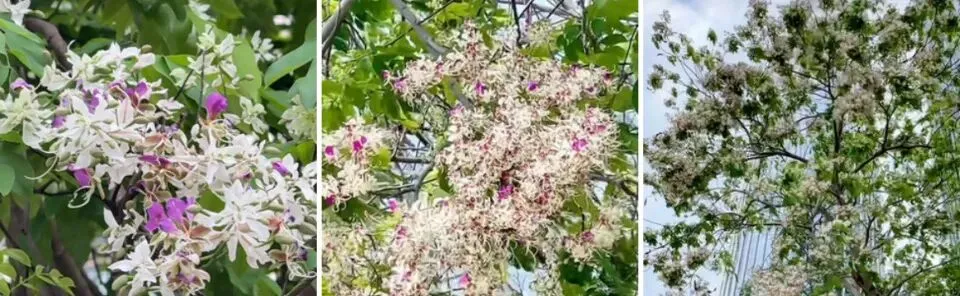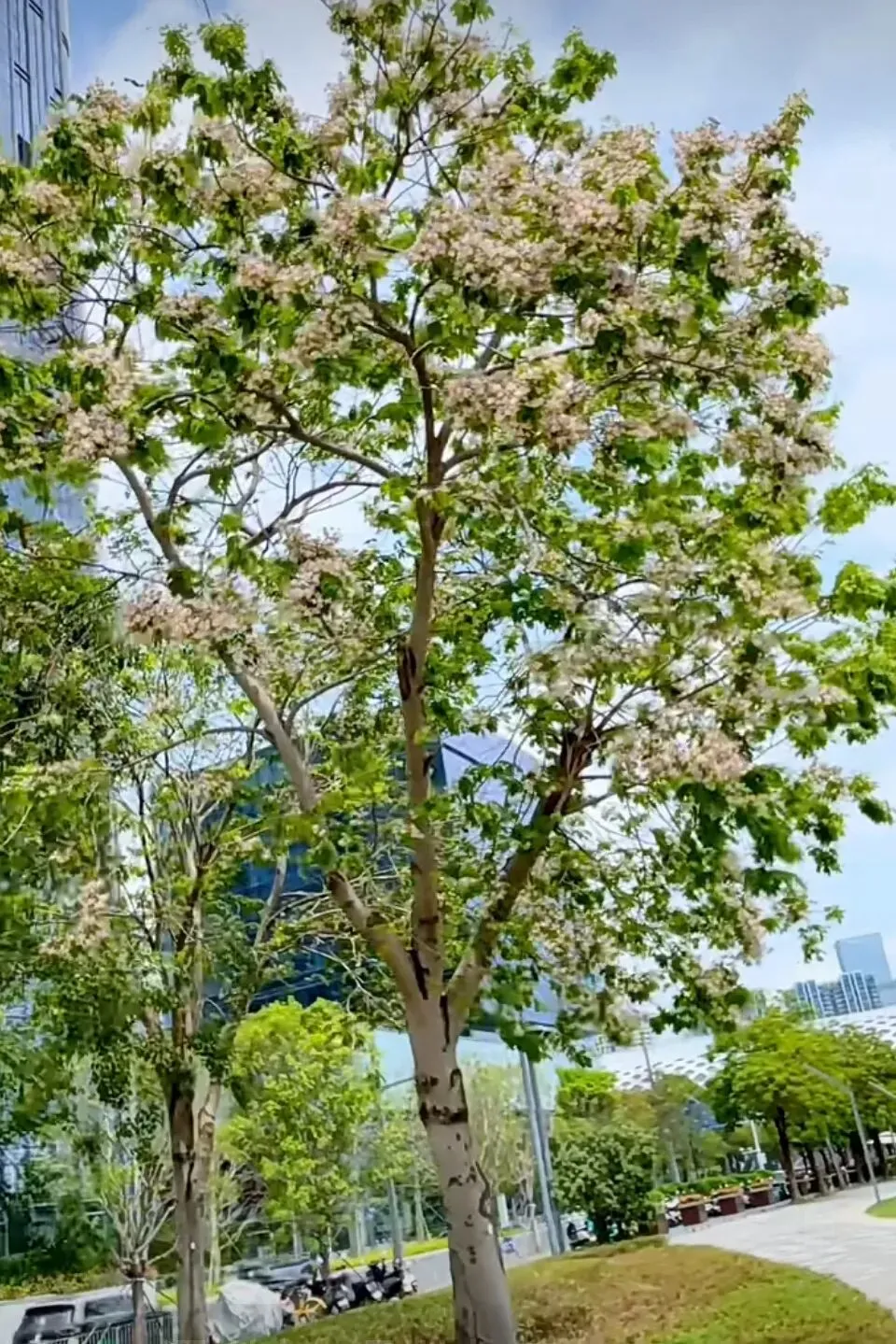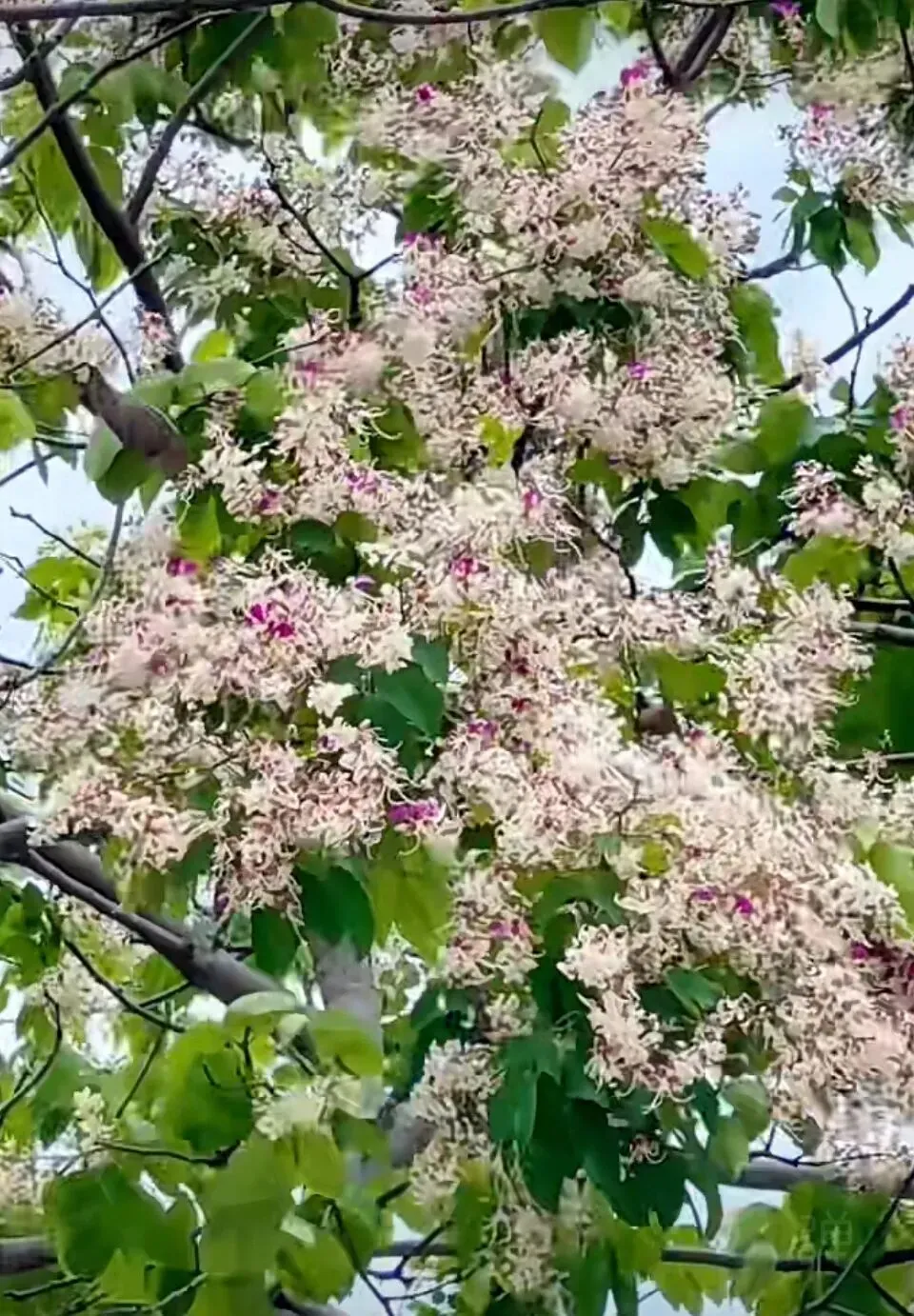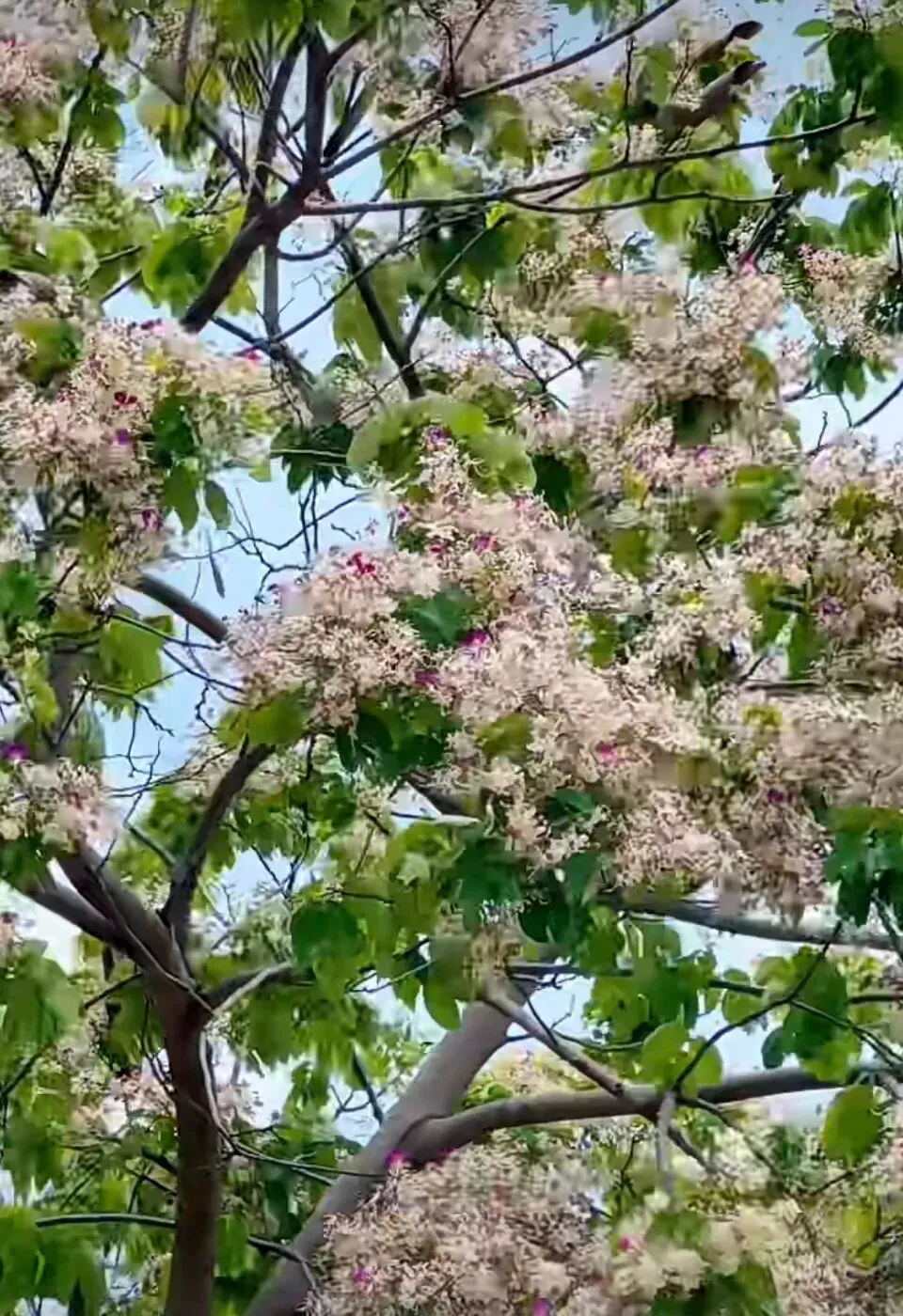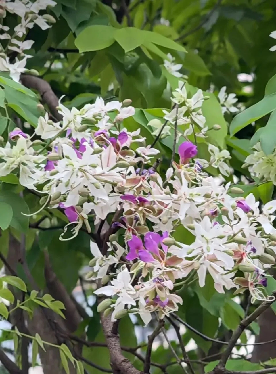 在深圳人才公园,走着走着就撞见了惊喜。高大的树直直地立在路边,身姿挺拔得很,粉白的花团缀满枝桠,还点着星星点点的紫,走近看树上的标签才知叫仪花树。