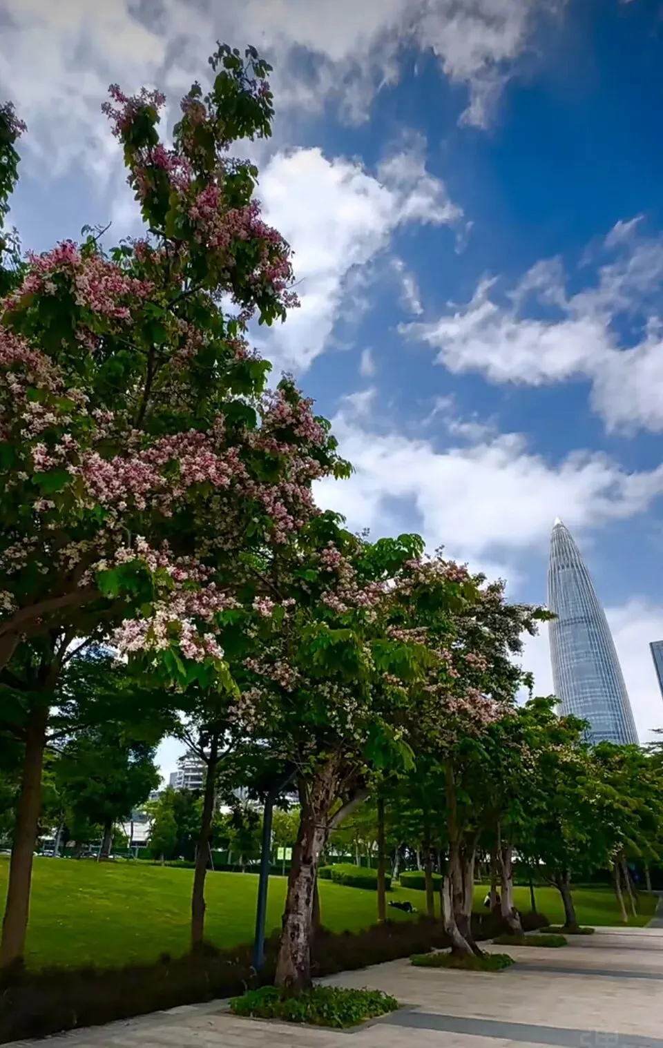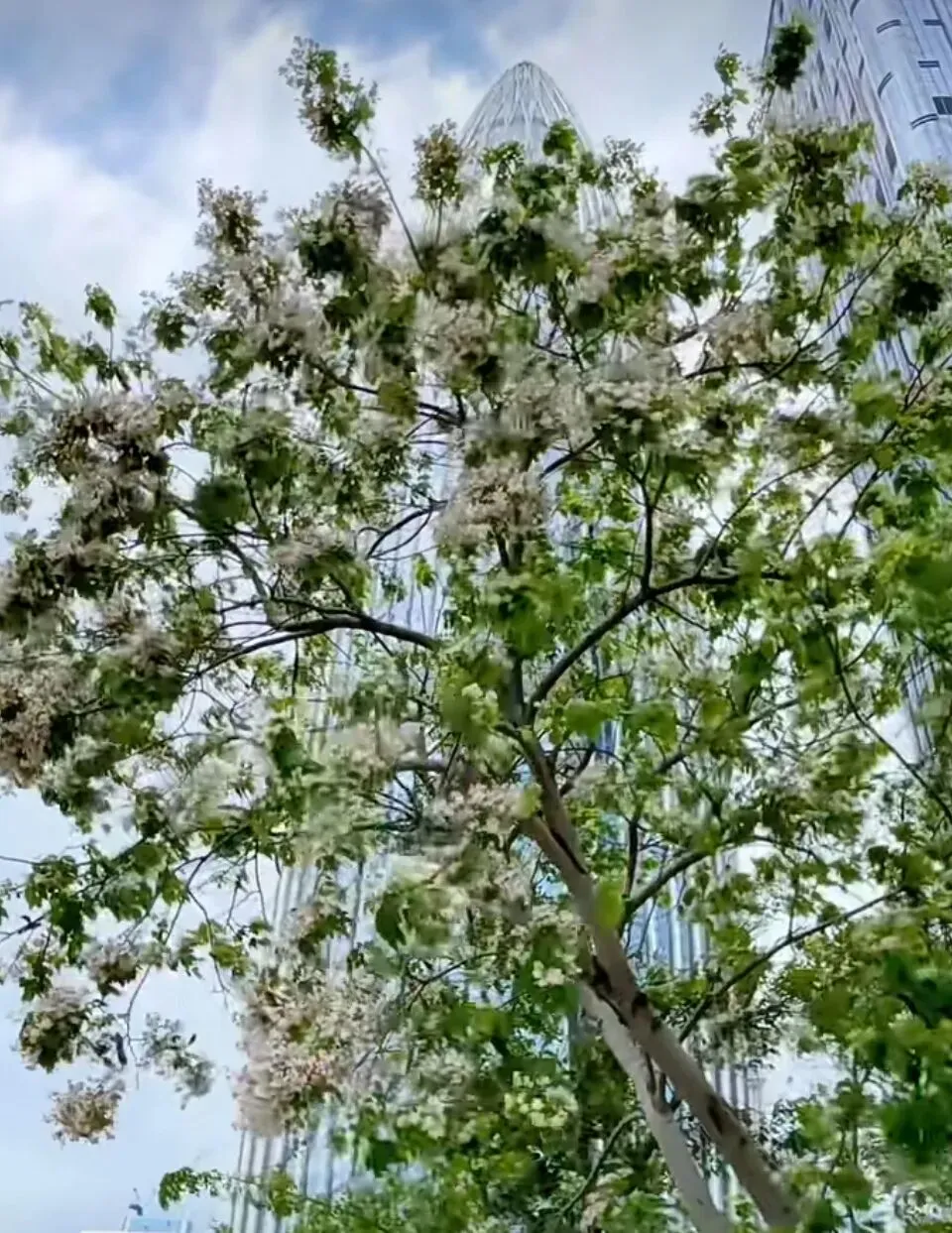 阳光从花缝里漏下来,在地上洒了一地光斑,背后是高楼的玻璃幕墙,春笋大厦的摩登轮廓与其相映成趣,倒衬得这树仪花更温柔了。