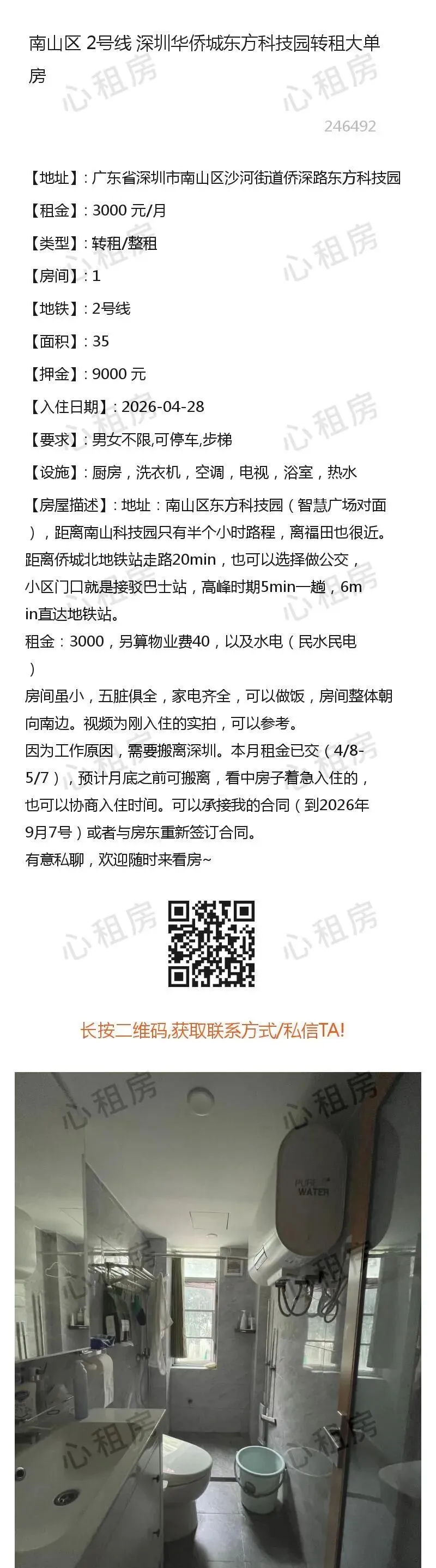 深圳租房【南山5则】房源①:2号线深圳南山华侨城东方科技园转租大单房3000元/月;房源②:…