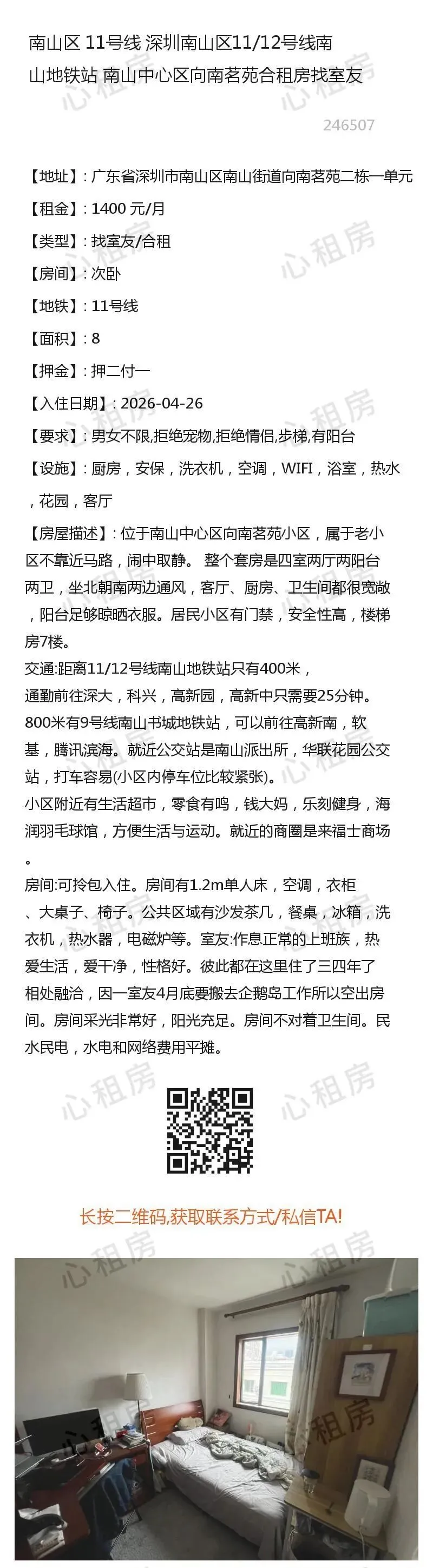 深圳租房>>南山区11号线深圳南山区11/12号线南山地铁站 南山中心区向南茗苑合租房找室友1400元/月