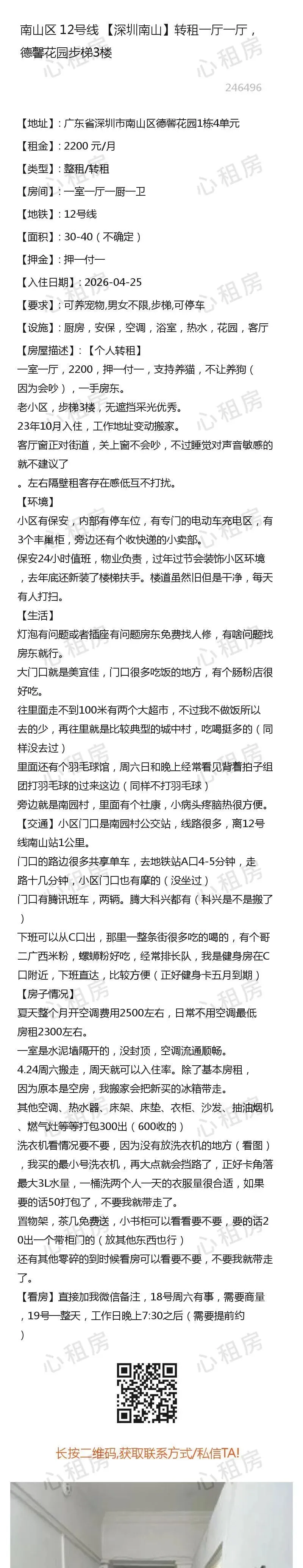深圳租房黑房东找房子罗湖合找室友合租短租深租房科技园深大豆瓣南山租房地铁租房龙华新福田罗湖光明新区坪山新区大鹏南山豆瓣1、所有房源信息均由网友投稿,委托本公众号/心租房(homhere.cn)发布,房源的真实性、合法性由提供者负责。2、请务必核实双方身份信息(身份证)、房产权属(产权证明)、转租权利(租赁合同)等基本信息。3、请务必实地考察房源并确保与出租方提供的基本信息一致。4、切勿轻易支付定金、保证金、打赏等,建议签订《租赁合同》后再进行交易。5、双方在房屋租赁过程中产生的一切纠纷,均与本公众号/心租房(homhere.cn)无关。6、近期欺诈团伙在境外以相亲交友、租房、国际包裹等名义实施杀猪盘、诱导下载未知app等进行刷单返利等欺诈的行为较多,请先确认对方身份,保护个人隐私和财产安全。