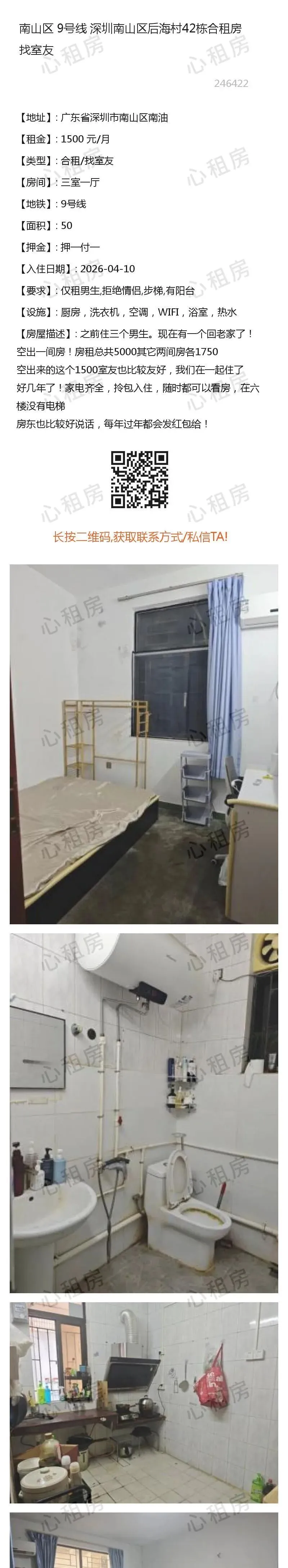 深圳租房>>南山区9号线深圳南山区后海村42栋合租房找室友1500元/月