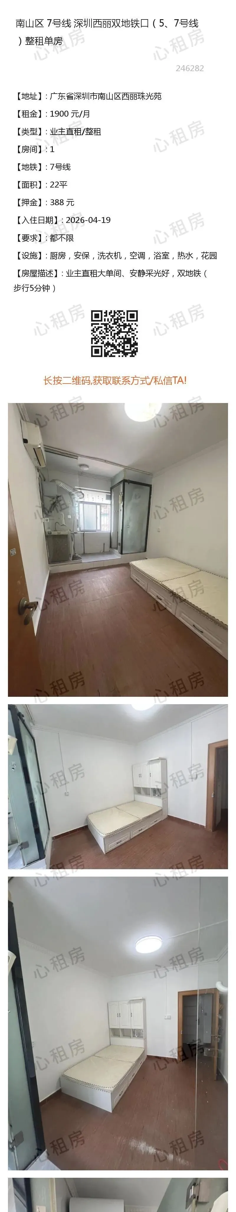深圳租房>>南山区7号线深圳西丽双地铁口(5、7号线)整租单房1900元/月