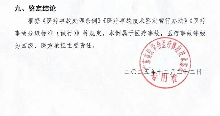 2025年12月22日,广东省医学会出具鉴定结论称,根据相关规定,该例属于医疗事故,医疗事故等级为四级,医方承担主要责任。