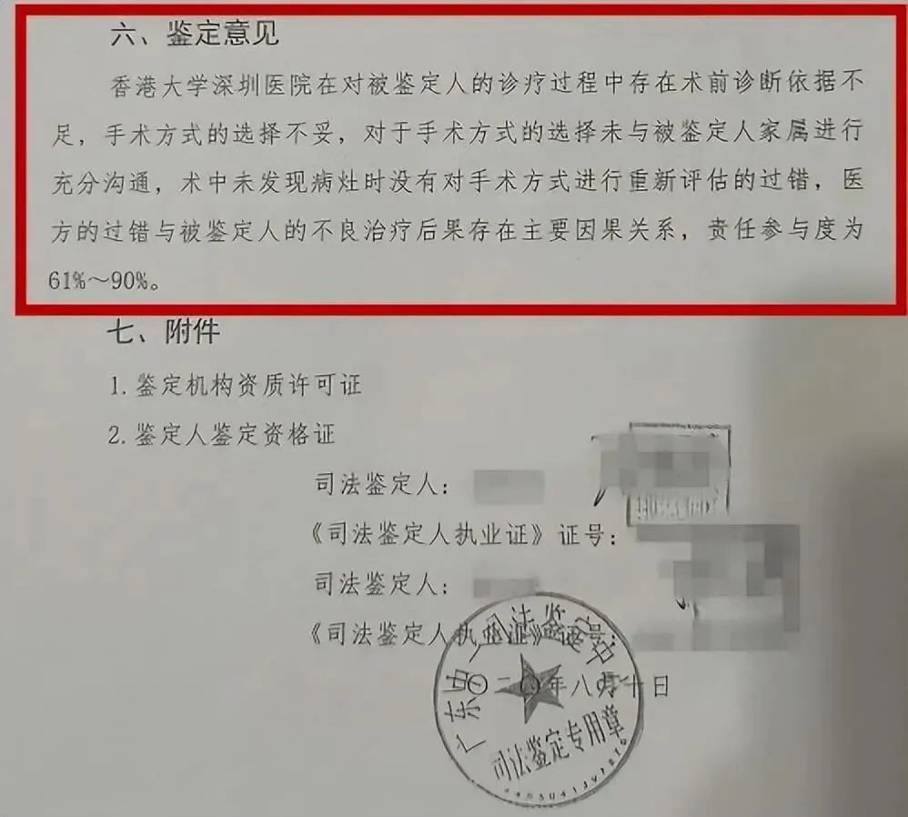 事发后,广东中一司法鉴定中心出具司法鉴定意见书称,香港大学深圳医院在张老太的诊疗过程中存在术前诊断依据不足,手术方式选择不妥,对于手术方式的选择未与她家属充分沟通,术中未发现病灶时没有对手术方式进行重新评估的过错,医方过错与张老太的不良治疗后果存在主要因果关系,责任参与度为61%-90%。