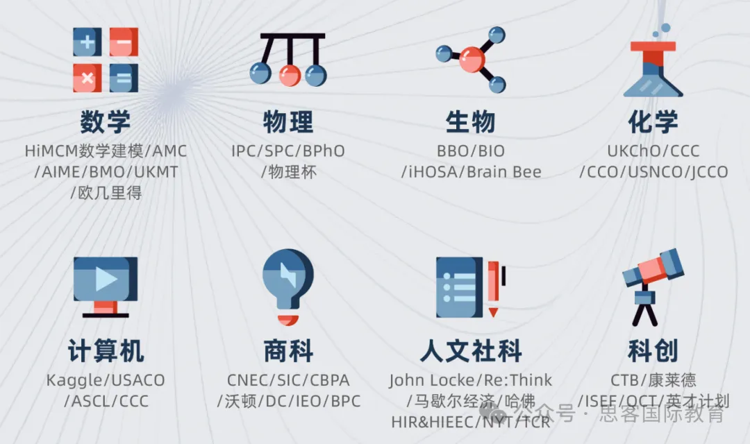 思客国际教育在国际教育行业深耕11余年,提供精准科学的规划方案,提炼出一整套包含规划原则、实用工具、多维表格在内的规划方案,帮助学生选择最适合的竞赛活动路径。所培养过的2w+学生遍布全球名校!我们可以提供的小初高学生提供的竞赛培训课程有: