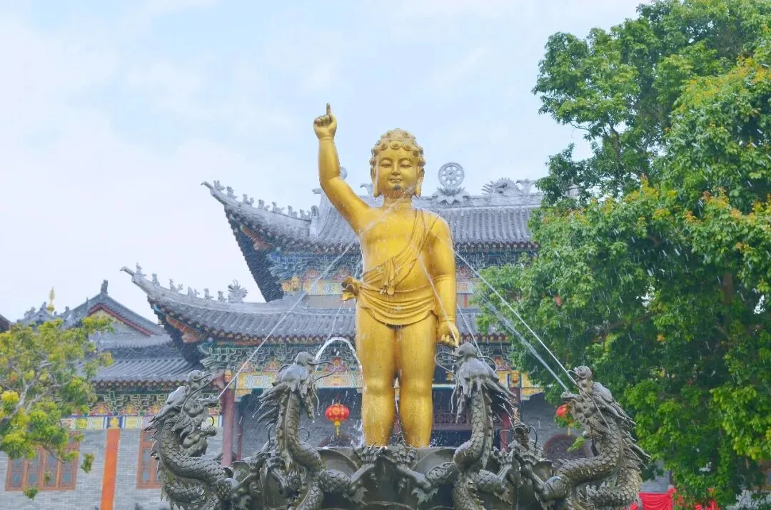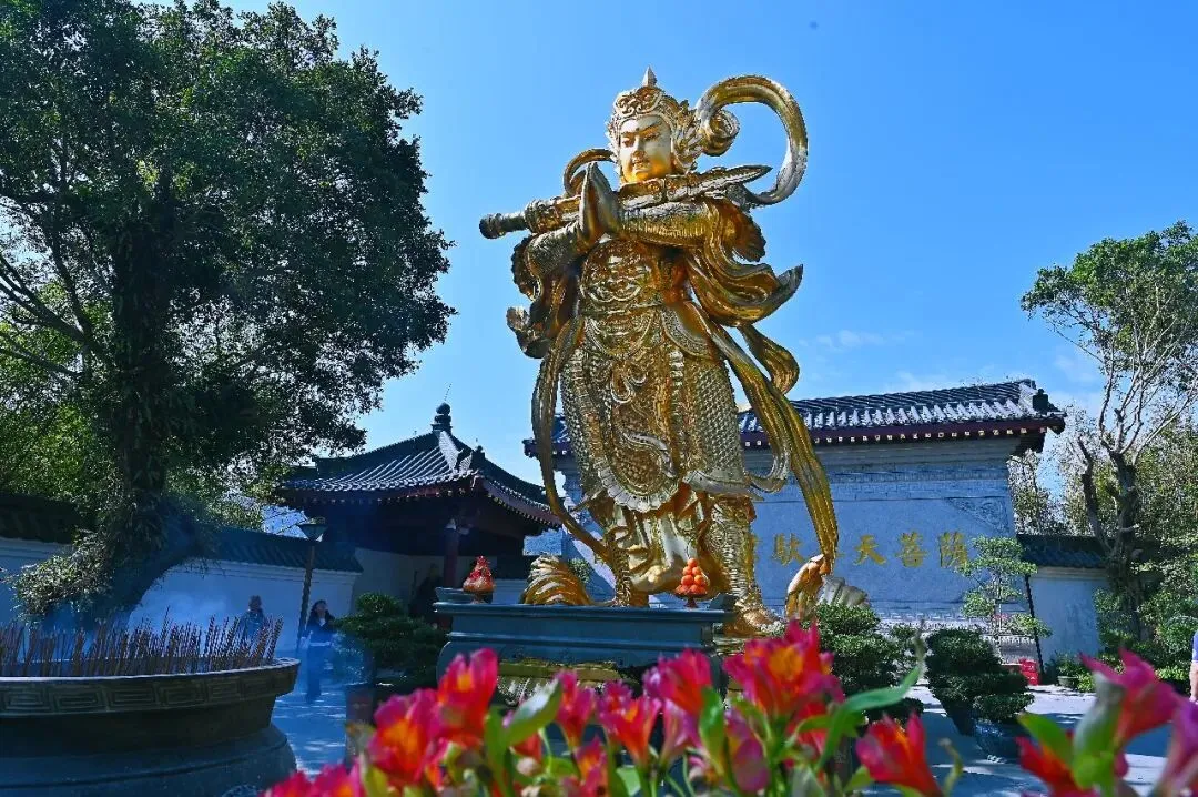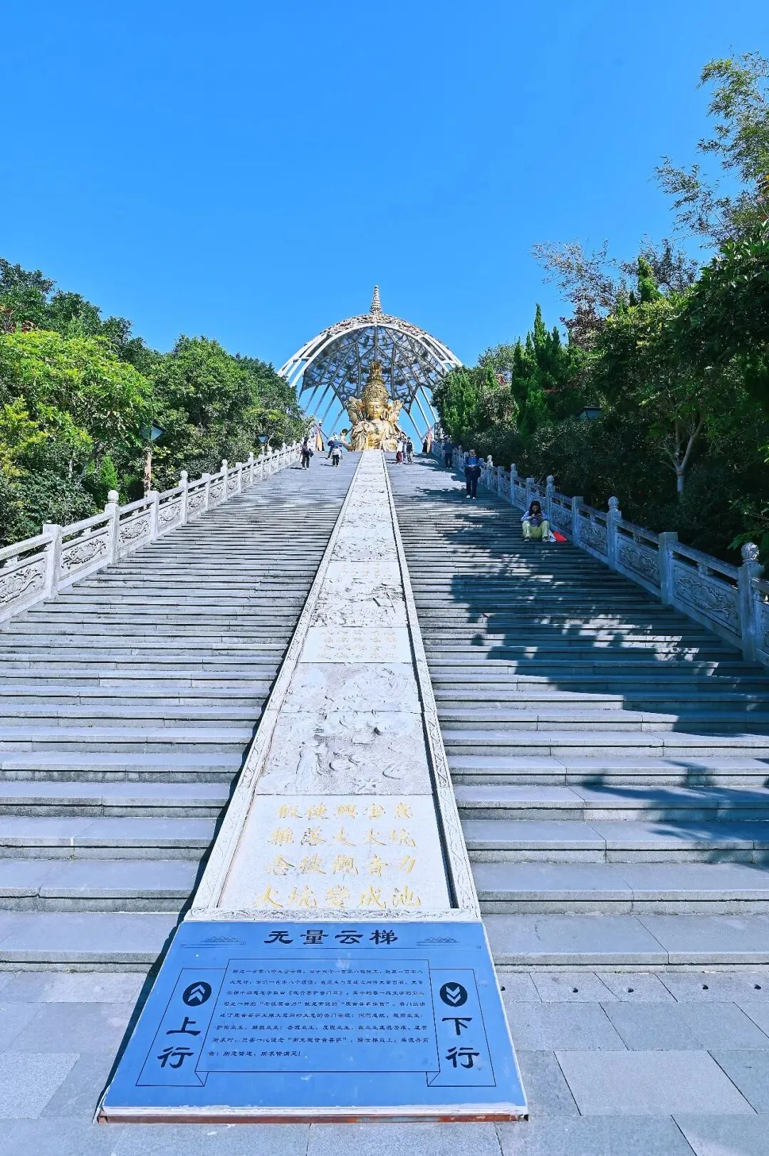 这里最引人注目的当属山顶那座四面观音金像——“观音座莲”宝像,分别由南面“圣观音”,北面“送子观音”,西面“莲华手菩萨”,东面“世间尊观音”组成,每当阳光照耀,金像就显得金光闪闪,好似佛光普照,感觉非常庄严雄伟、富丽堂皇。