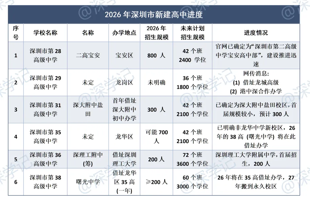 2026年深圳将新增多所公办高中,布局坪山、宝安、盐田、罗湖、龙华等区域。既有名校分校、高校附属中学,也有集团化办学新校。