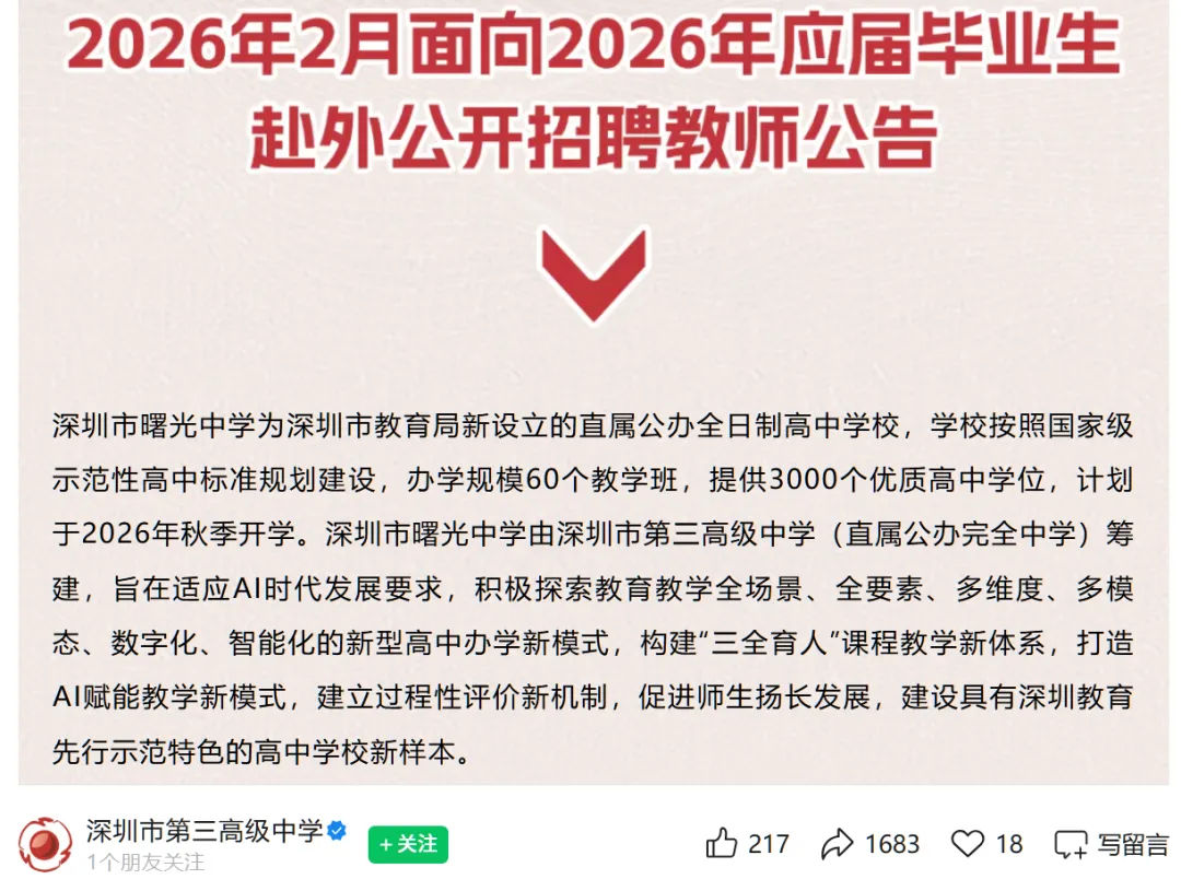 截至目前,2026年深圳共4所高中确定招生: