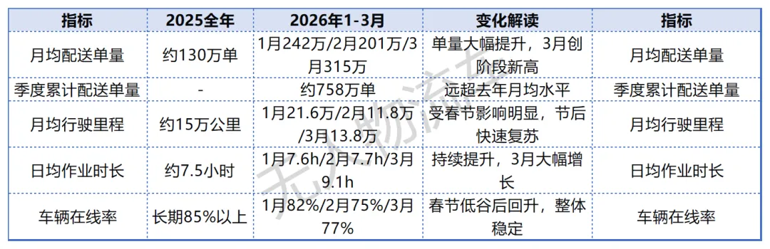 2026年1-3月:1月配送单量242万单(创历史新高),2月受春节影响降至201万单(环比下降17%),3月快速回升至315万单(环比增长57%),其中快递配送300万单,占比超95%,生鲜配送15万单;