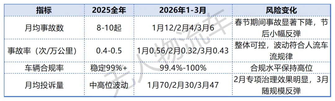2026年1-3月:1月事故12起,事故率0.56次/万公里(环比上升12%);2月事故4起,事故率0.32次/万公里(环比下降12%),创近年新低;3月事故6起,事故率0.43次/万公里(环比上升36%),呈现“春节低发-节后反弹”的规律。