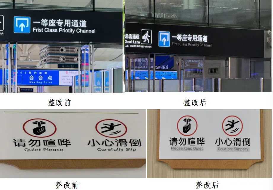 对于外文公示语的整改,机场在内部排查的同时,也会收集工作人员、旅客及各类志愿者发现的问题,第一时间记录问题详细情况,同时举一反三开展全区域系统性排查。对排查发现的问题,会依托标准规范文件,并联合市外办专业人员重新翻译、审核,依据审核后的内容快速制作新标识,争取在最短时间完成更换。