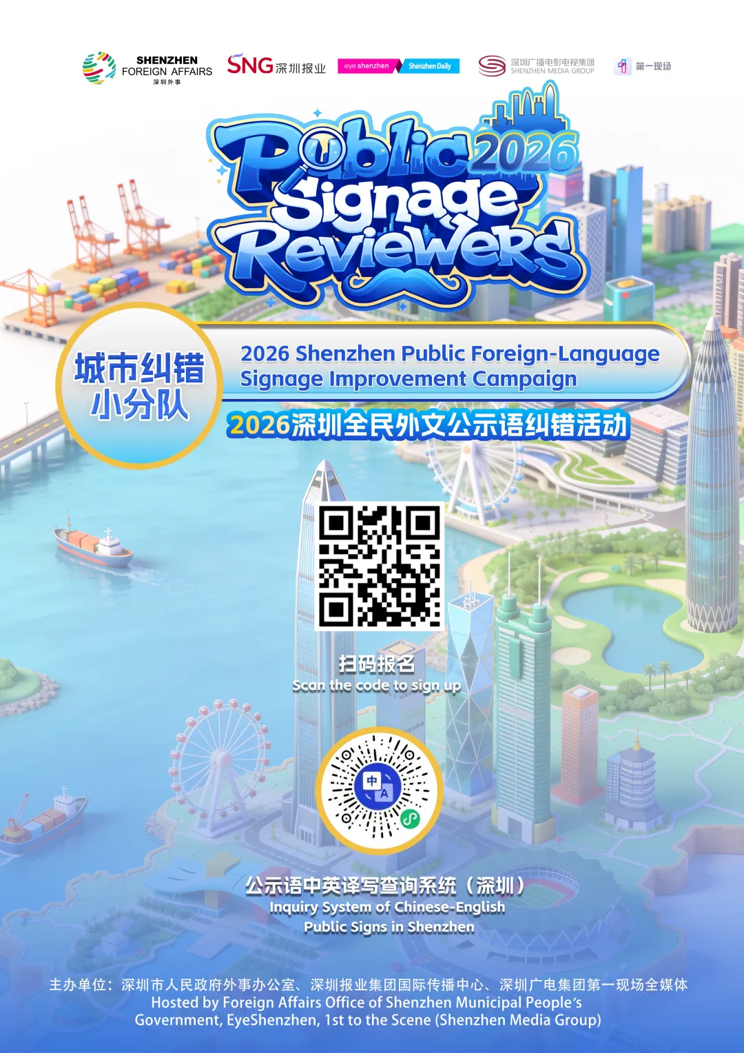 今年,深圳市人民政府外事办公室、深圳报业集团国际传播中心(EyeShenzhen)和广电集团第一现场全媒体共同发起全民外文公示语纠错活动,活动以公示语中英译写查询系统(深圳)的“社区”功能为核心平台,鼓励广大市民注册参与,依据积分榜排名及意见质量给予相应奖励。