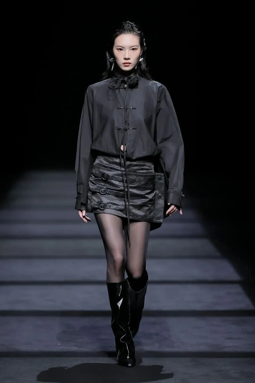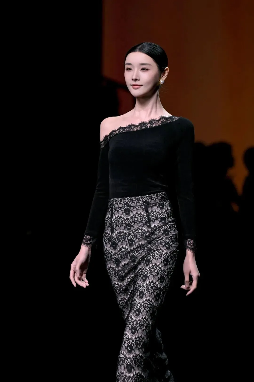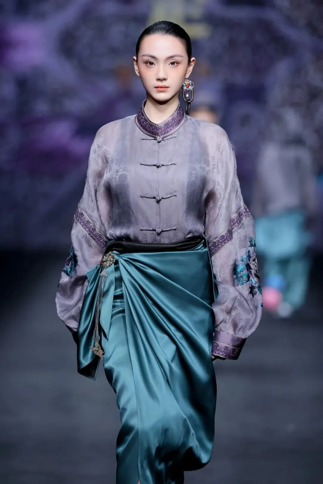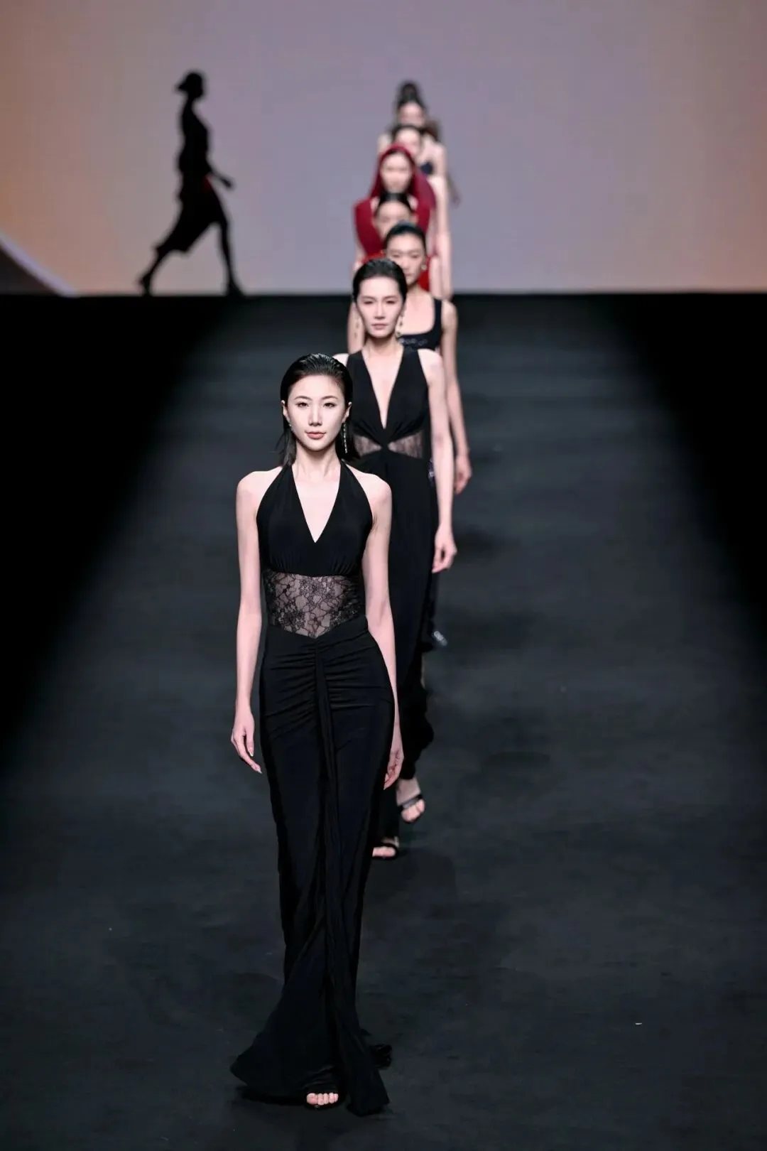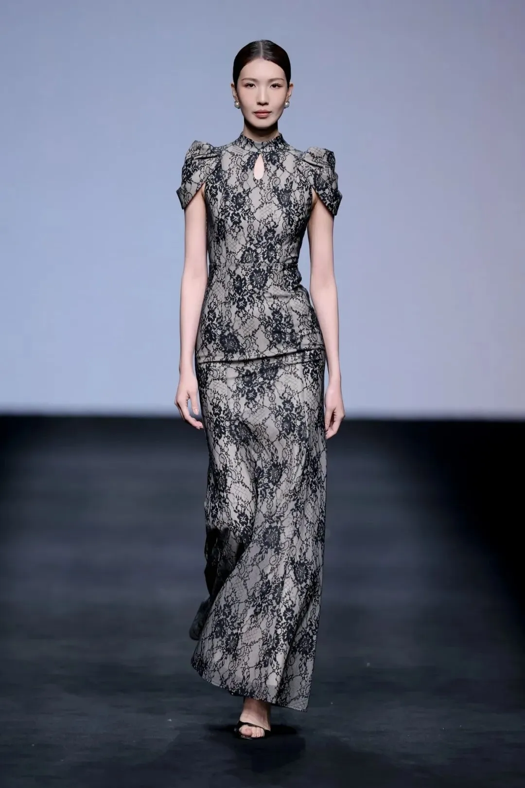 这是一场专属于时装的无声叙事。灯光成为情绪的主语:暖光沉敛时,模特身着传统改良中式,藏旧制风骨;冷光骤转,解构先锋设计登场,破陈规边界;白光舒展,当代锋芒在肩线间绽放。从传统改良中式的工艺沉淀,到解构先锋设计的态度表达——裁去桎梏,变赴新生。