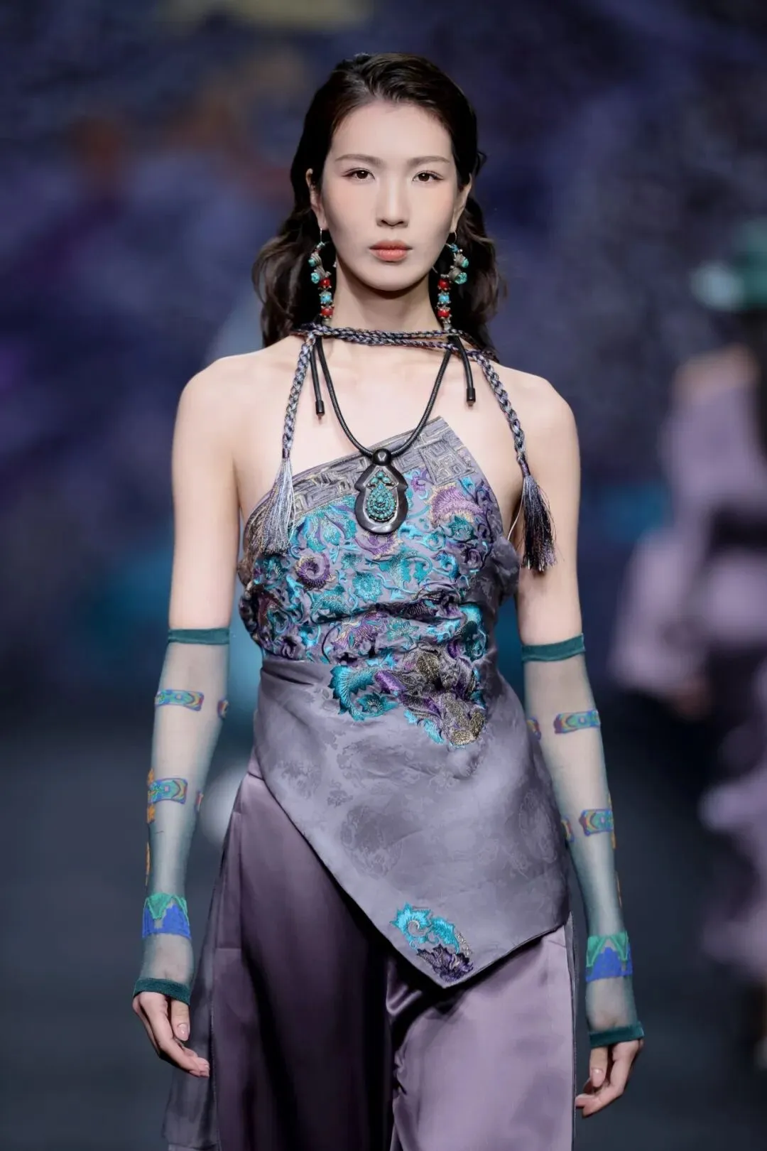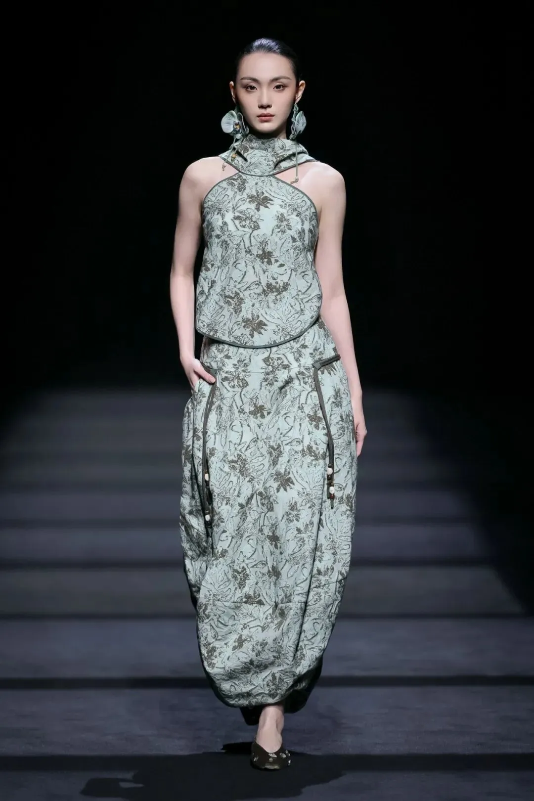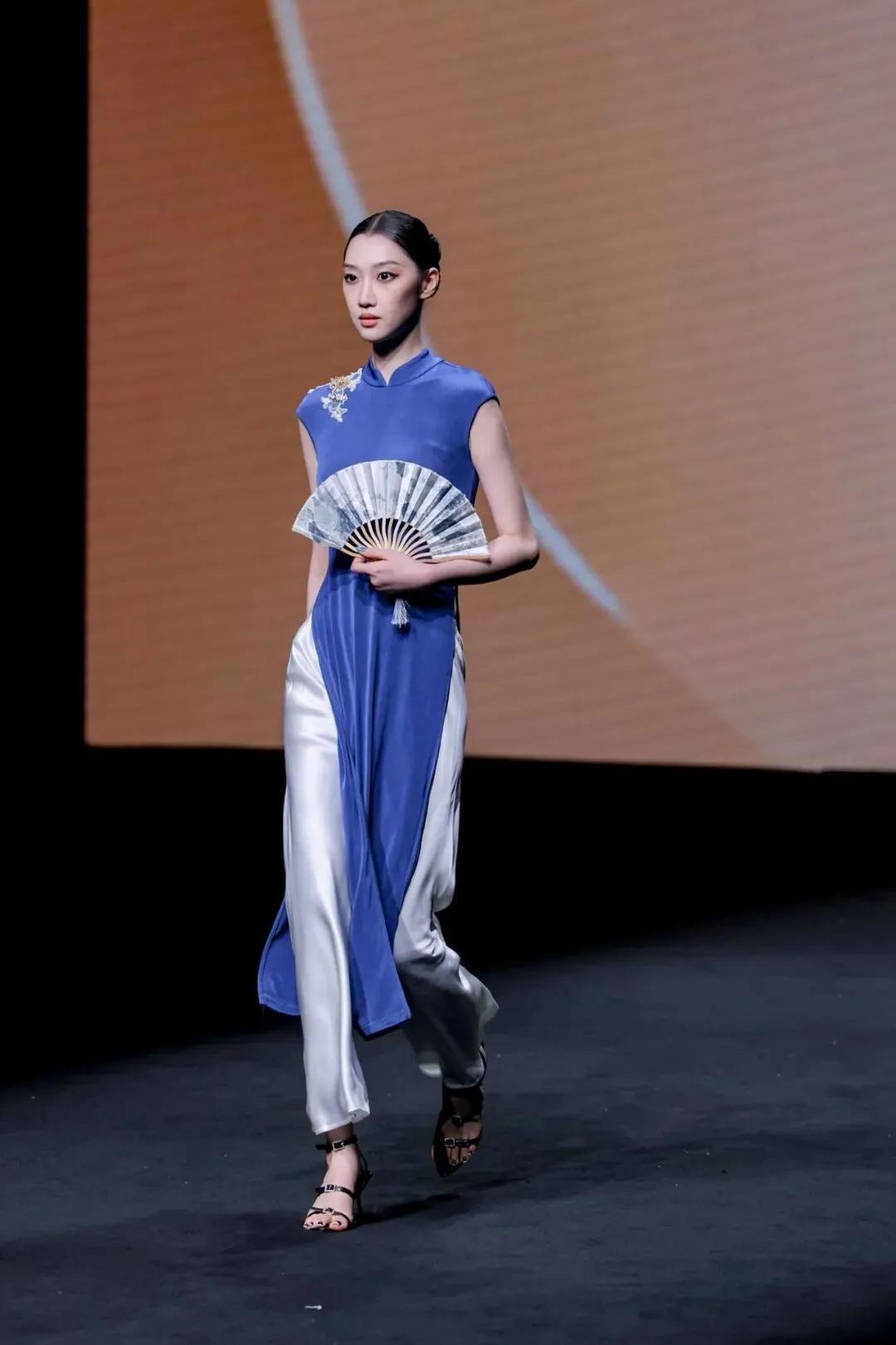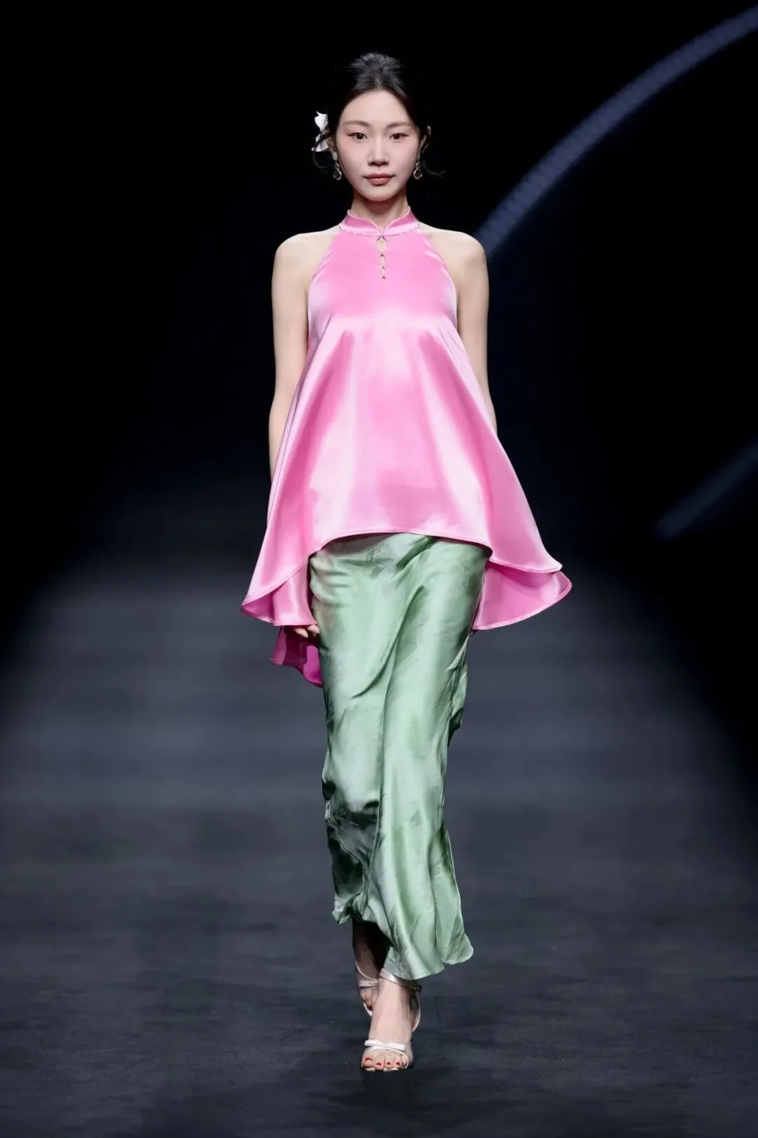 这是一场专属于时装的无声叙事。灯光成为情绪的主语:暖光沉敛时,模特身着传统改良中式,藏旧制风骨;冷光骤转,解构先锋设计登场,破陈规边界;白光舒展,当代锋芒在肩线间绽放。从传统改良中式的工艺沉淀,到解构先锋设计的态度表达——裁去桎梏,变赴新生。