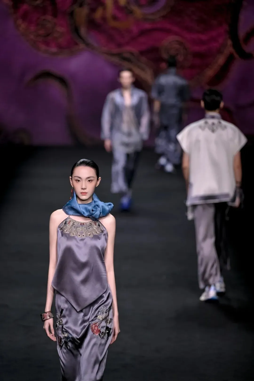 开幕大秀由走心品牌担纲。“归莨”——归,是回归本源,回归华夏文脉,回归内心沉静;莨,是香云纱之根,是天地造化,是时间的肌理。