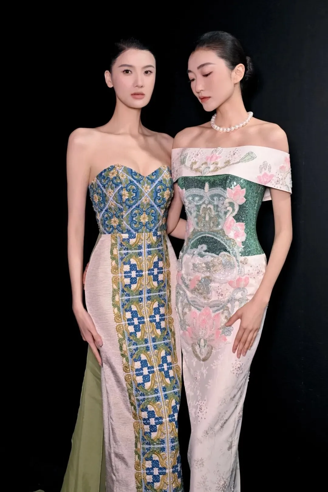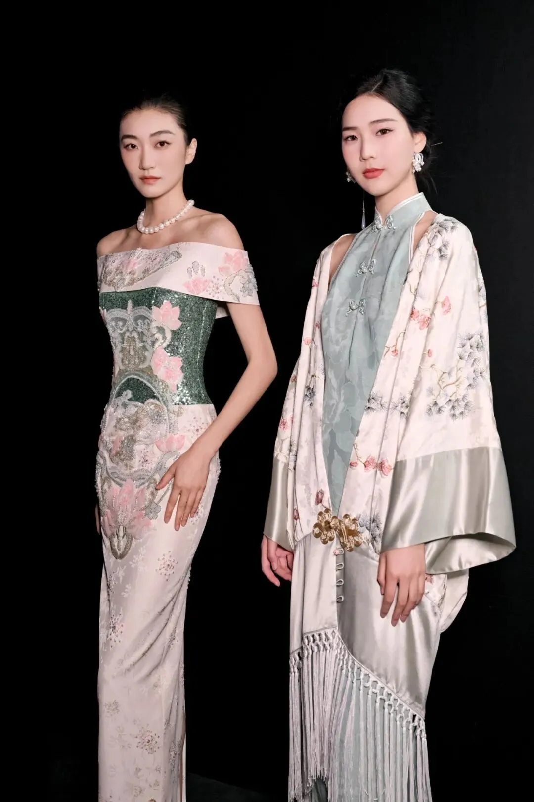 誉褂的钉金绣率先登场。将中式立领与葡萄牙瓷纹层叠,水墨意境与西方剪裁共生。