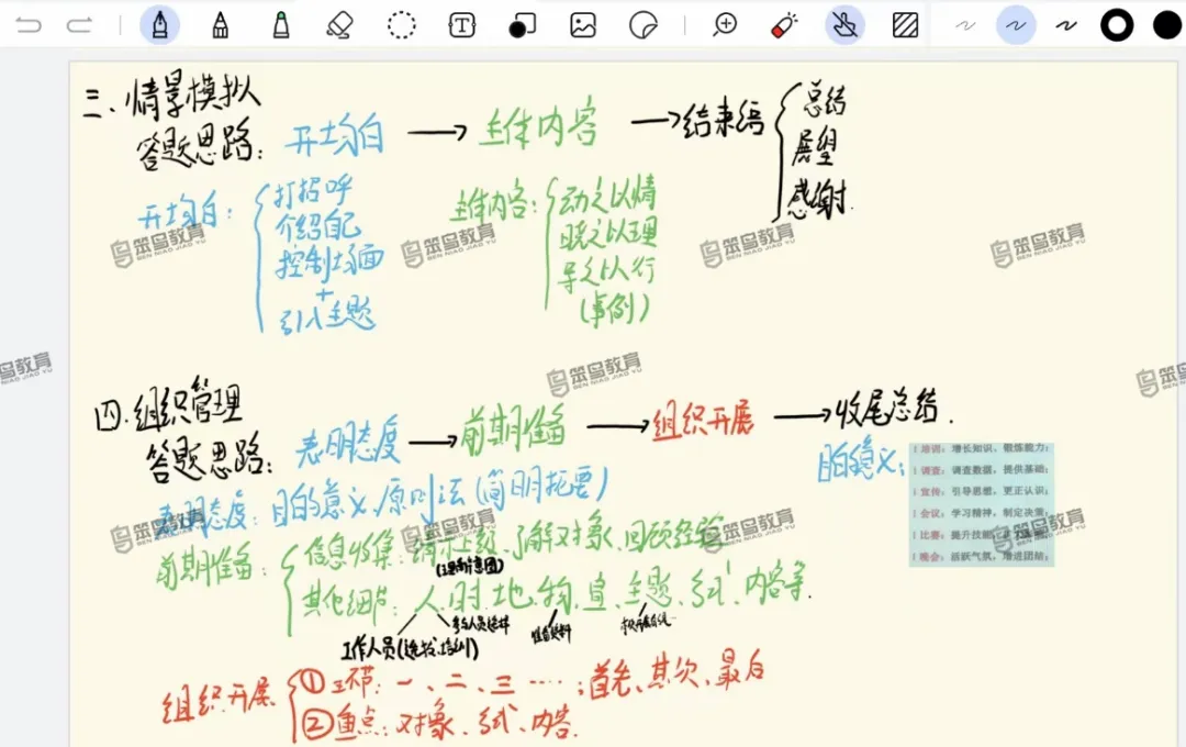 我选择的是笨鸟教育中9天的面试课程,在面试班的学习中,老师会按照不同的类型、不同的话题来进行讲解,老师在上课的过程中也会给我们留足时间整理好不同类型题目的思考和回答的框架和主要方向,对于一些常考的话题老师也会提供很多的素材和必答点,我们在上课中需要在笔记本上记下老师标出的不同类型题目的答题框架和答题素材、内容等,这对我们后面的练习至关重要。老师在讲解完课程的知识后会给我们一道例题进行操练,在我们思考过后会对题目进行详细的讲解,保证每一个同学都能吸收上课的知识。