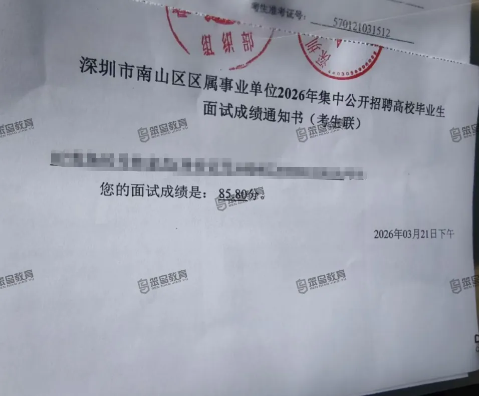 我在深圳市事业编南山区面试中获得了一个不错的成绩,对于面试小白的我来说非常满意,并且我认为我的面试经历和面试分数是可复制的,适用于每一个参加事业单位面试的小伙伴。