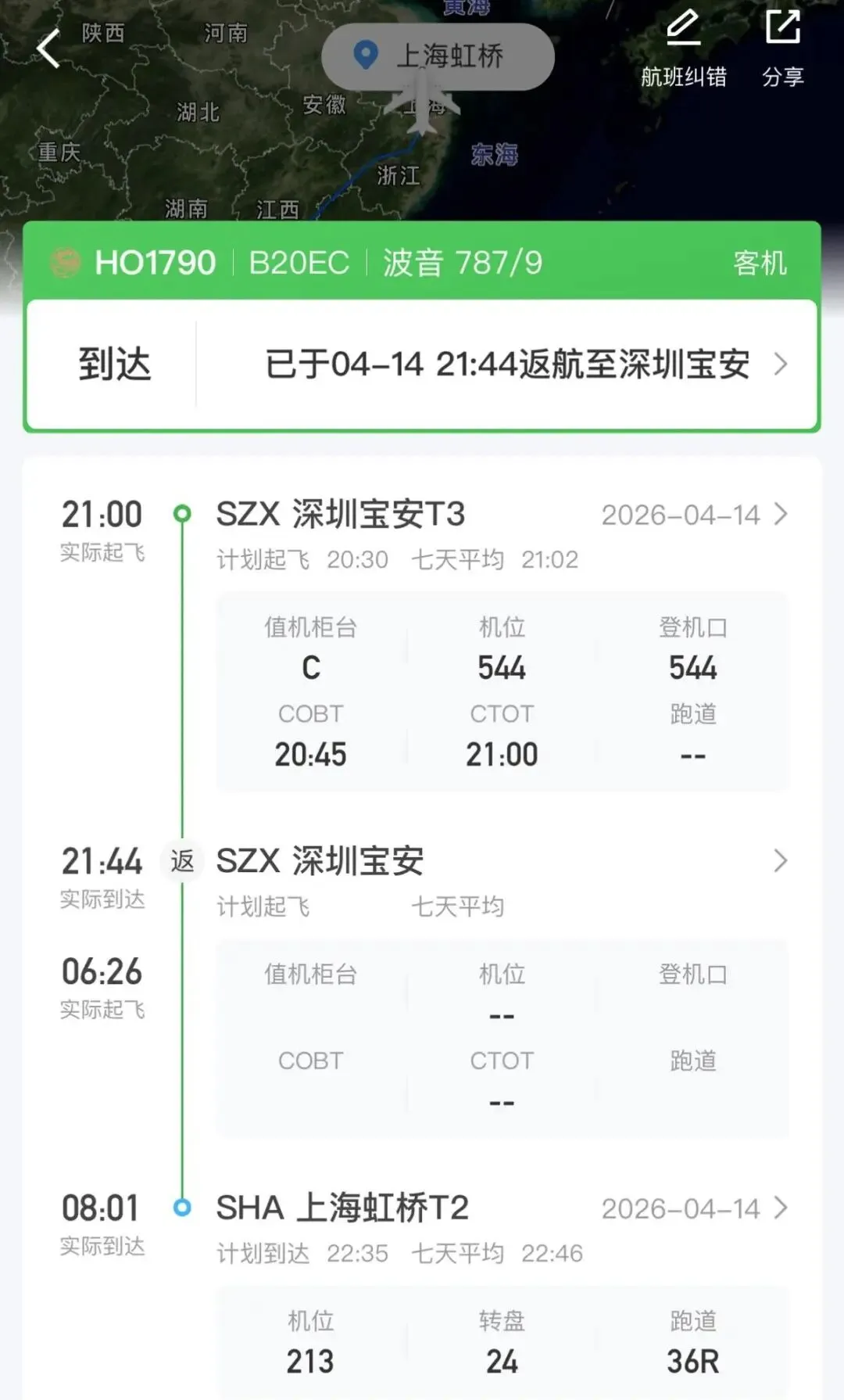 据“飞常准”App显示,4月14日吉祥航空HO1790航班执飞飞机为波音787-9宽体机,机龄2年,编号B20EC。该航班原计划20时30分从深圳宝安起飞,实际起飞时间为21时;原计划22时35分抵达上海虹桥机场,实际到达时间为15日早上8时01分。航班动态显示,该航班于14日21时44分返航至深圳宝安机场后,于15日6时26分再次起飞,其间曾出现盘旋。