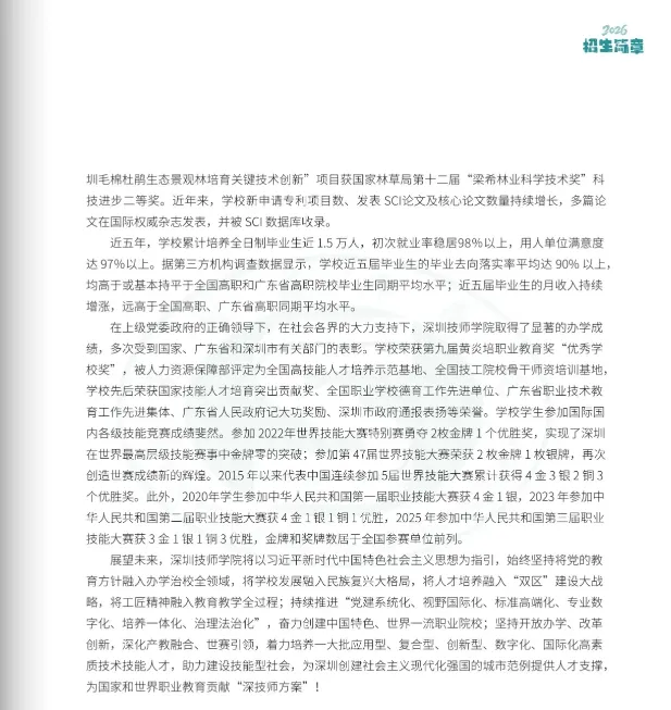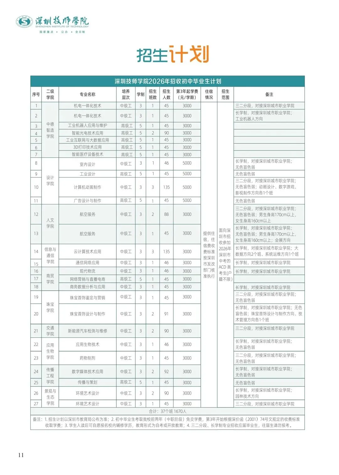 重磅来袭!深圳技师学院2026年招生简章发布!作为深圳市第一所公办技师学院、国家重点技工院校,深圳技师学院始终走在职业教育前沿。 2026年,学院招生规模再升级,长学制拟招11个专业,三二分段拟招7个专业,为学生提供“技能+升学”双保障。三二分段