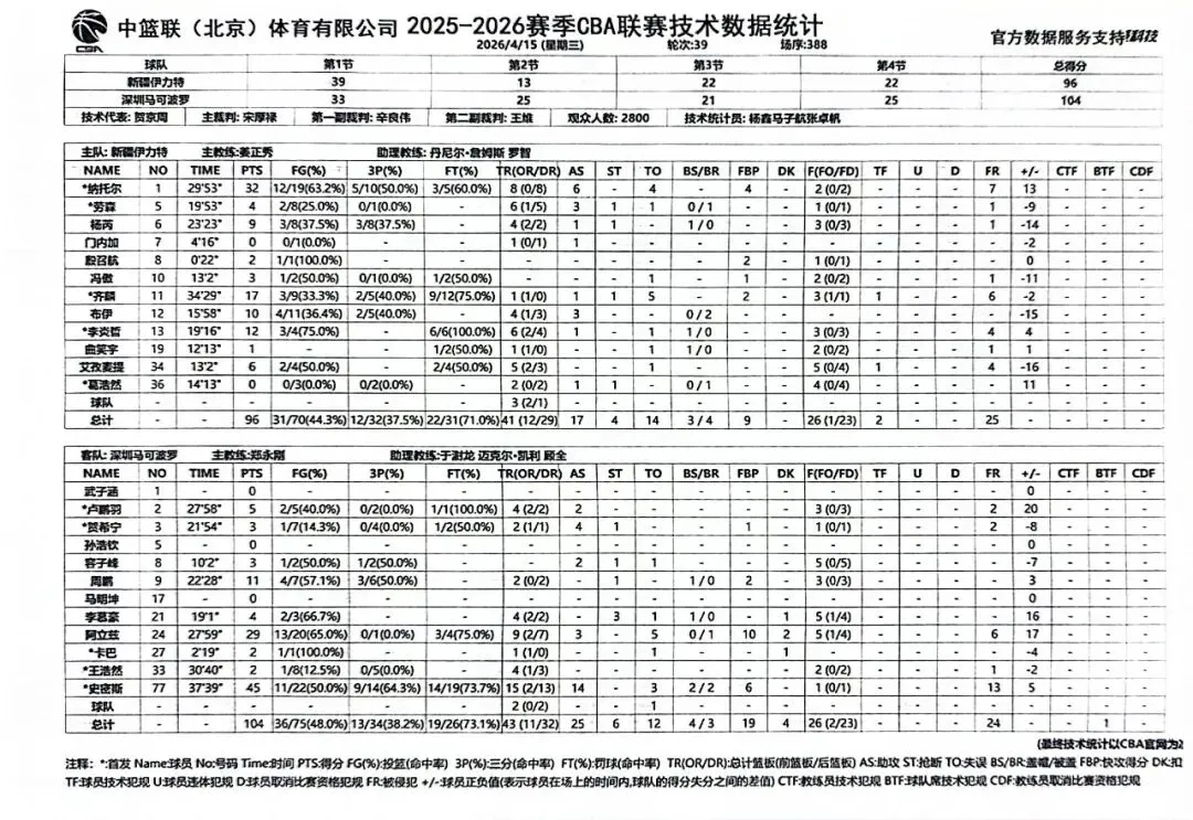北京时间2026年4月15日,2025-2026赛季CBA常规赛继续进行,新疆伊力特坐镇主场对阵深圳马可波罗。此役新疆伊力特开局状态火热取得领先,此后双方陷入拉锯战,新疆伊力特在末节一度实现反超,最终以96-104不敌深圳马可波罗。