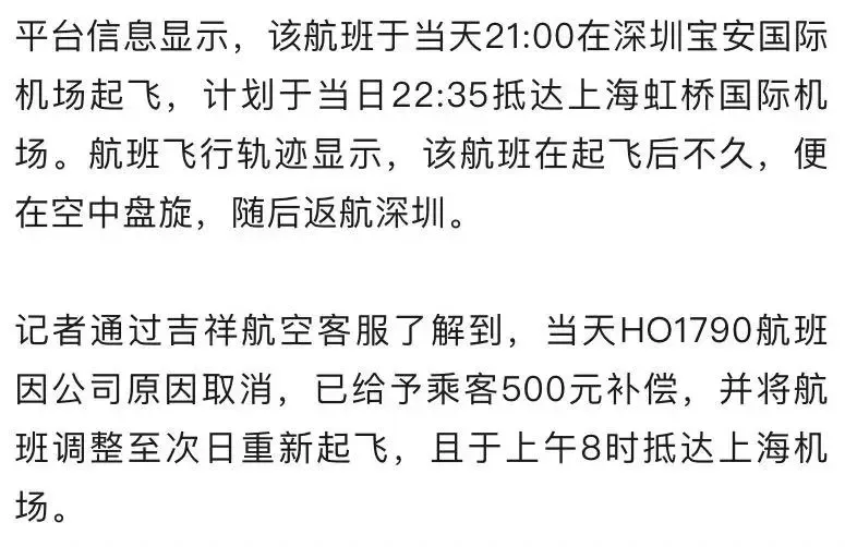 记者通过飞常准平台查询了解到,涉事航班为吉祥航空HO1790。