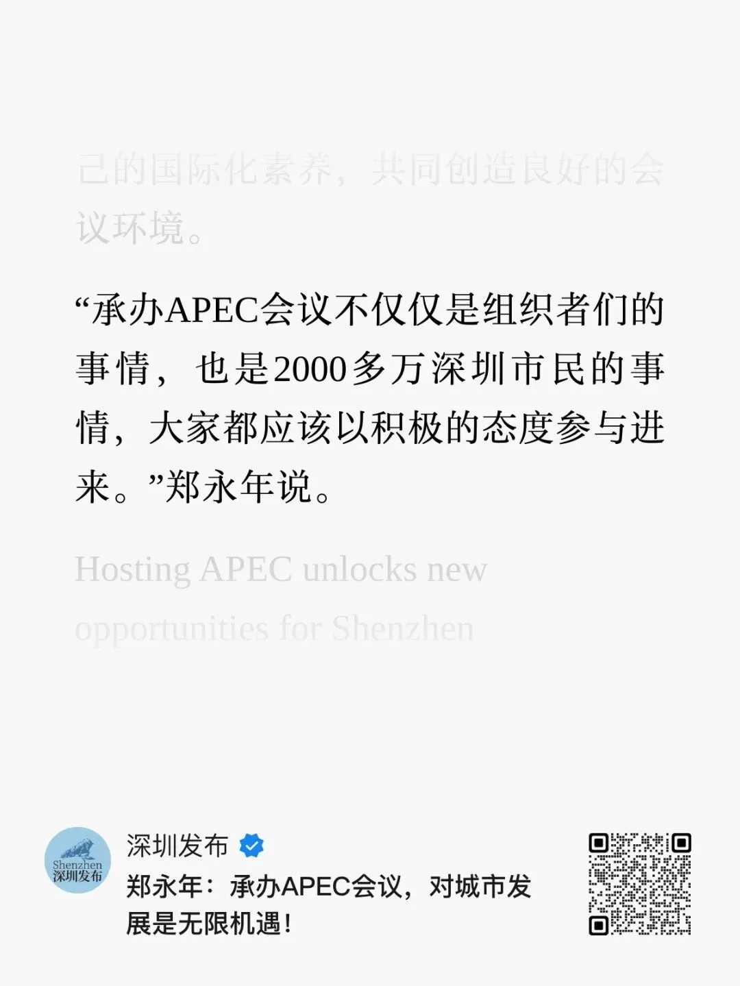 最近看到《深圳发布》在 2026 年 4 月 15 日发布的 APEC 相关访谈报道文章中,郑永年教授提到 “承办 APEC 会议也是 2000 多万深圳市民的事情”,这里是否说明深圳人口达到了2000万呢?这是什么人口?常住人口吗?