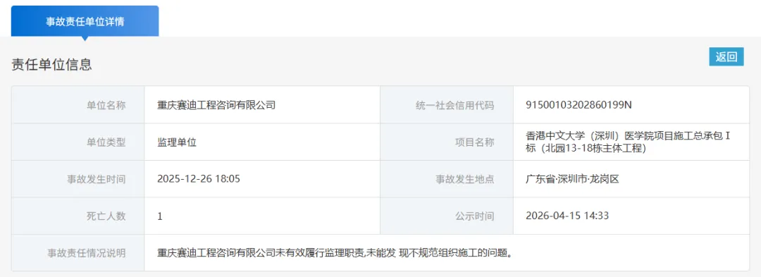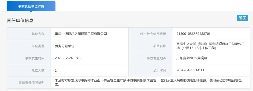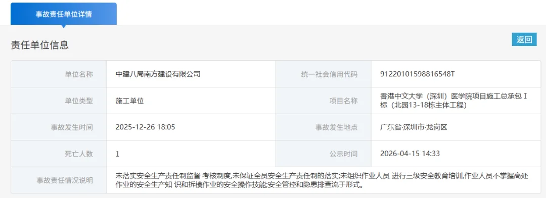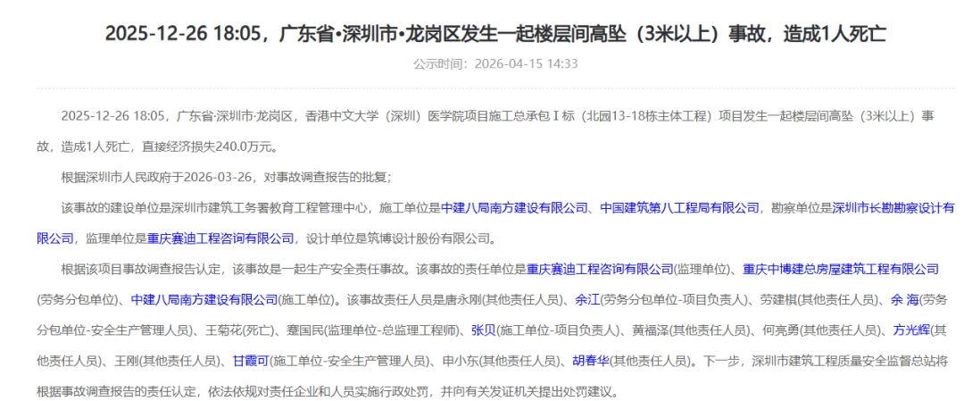 2026年4月15日,深圳市官方公示香港中文大学(深圳)医学院项目高坠事故处理进展,该事故造成1人死亡,被认定为生产安全责任事故,涉事多单位及13名责任人将被依法追责。事故详情:2025年12月26日18时05分,广东省深圳市龙岗区香港中文大学(深圳)医学院项目施工总承包I标(北园13-18栋主体工程)发生一起3米以上楼层间高坠事故,造成1人死亡(死者王菊花),直接经济损失240.0万元。