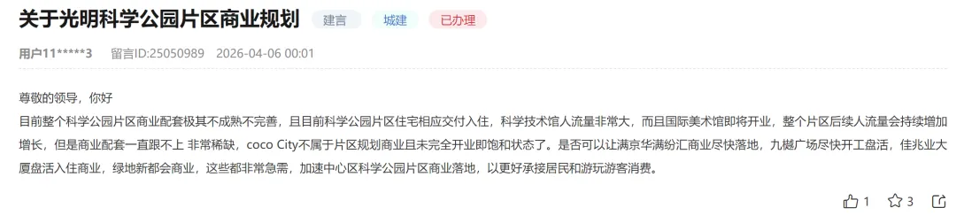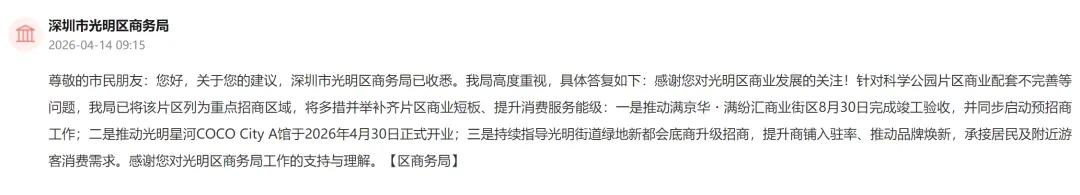近期,奥一记者关注到,有市民通过人民网领导留言板建言,希望加快推进光明科学公园片区商业建设,这一留言,得到了光明区商务局的积极回应。