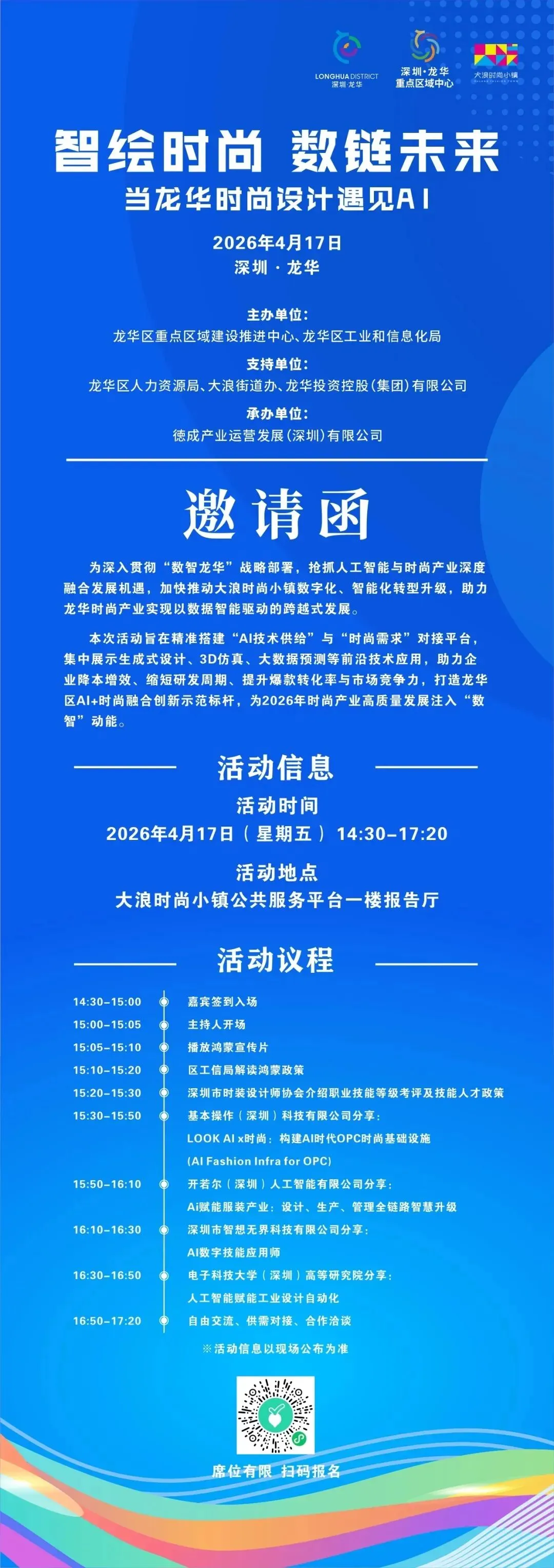 时间: 4月17日(周五)14:30-17:20地点: 大浪时尚小镇公共服务平台一楼报告厅