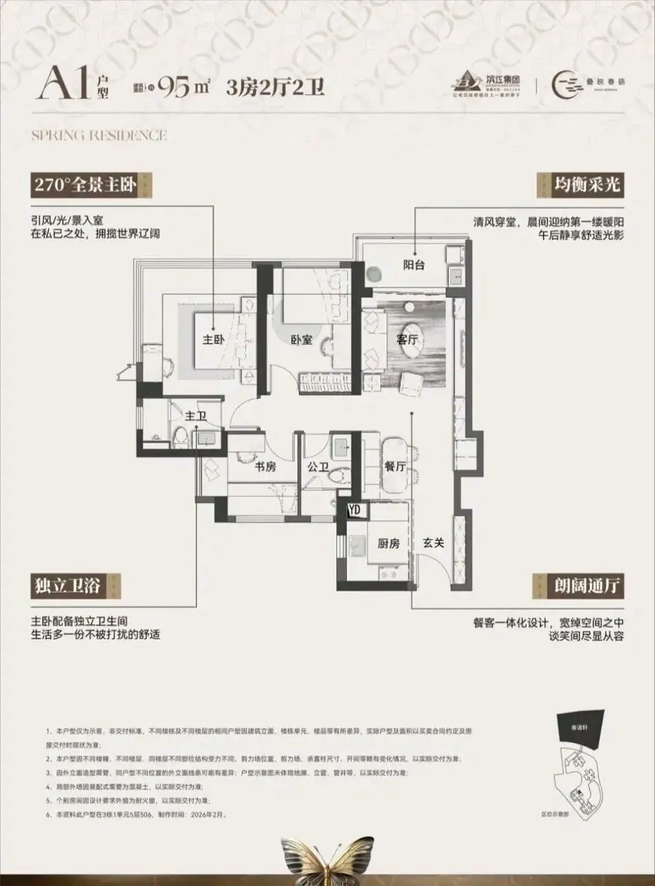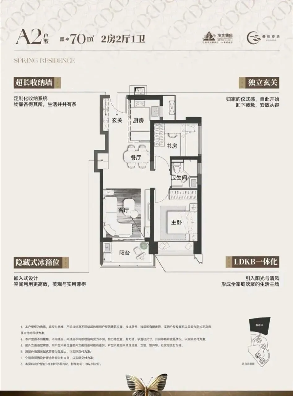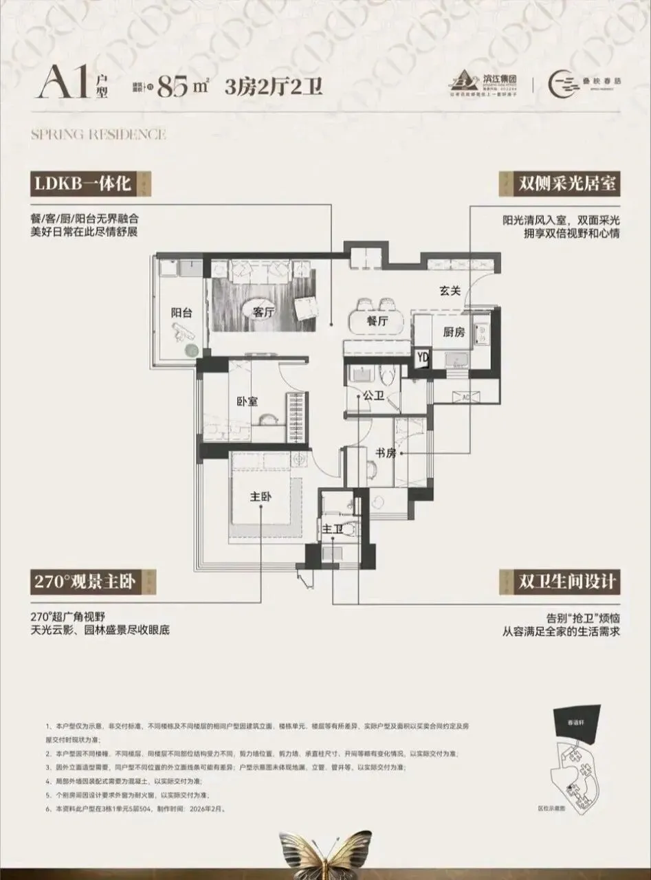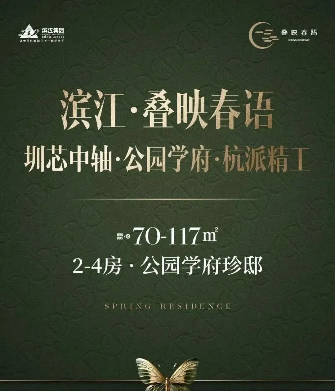 滨江·叠映春语项目由滨江集团打造,总占地面积约3.45万㎡,总建筑面积约30.48㎡,计容建筑面积约21.45万㎡,容积率5.76,绿化率40.01%。项目分叠映轩+春语轩2个地块打造,共由6栋总高43-50层的住宅组成,地块之间有连廊相接,总共规划2005户,其中公租房420套,可售商品房有700多套,其它都是回迁房,规划车位2369个,车位配比约1:1.18。